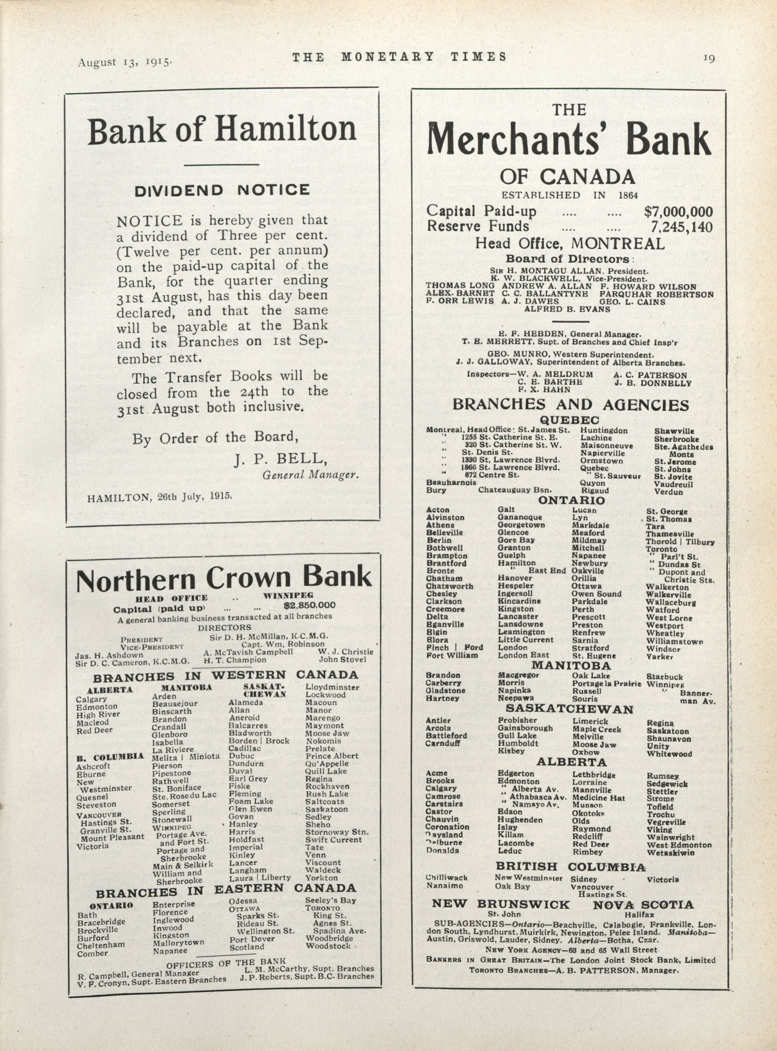 The monetary times, trade review and insurance chronicle : Volume 55 No. 7 (August 13, 1915)