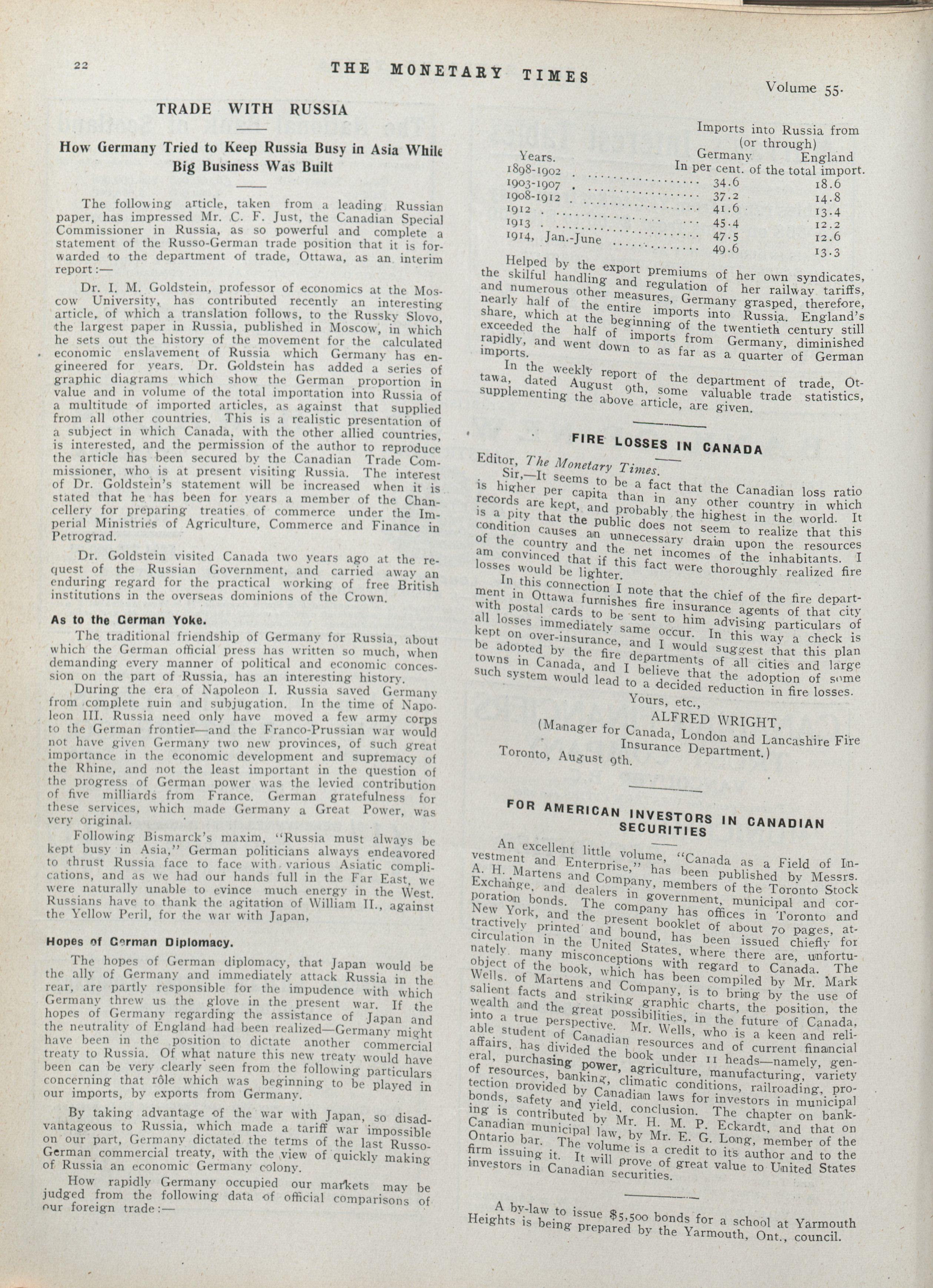 - The Monetary Times, trade review and insurance chronicle. : Volume 55 No. 7 (August 13, 1915)
