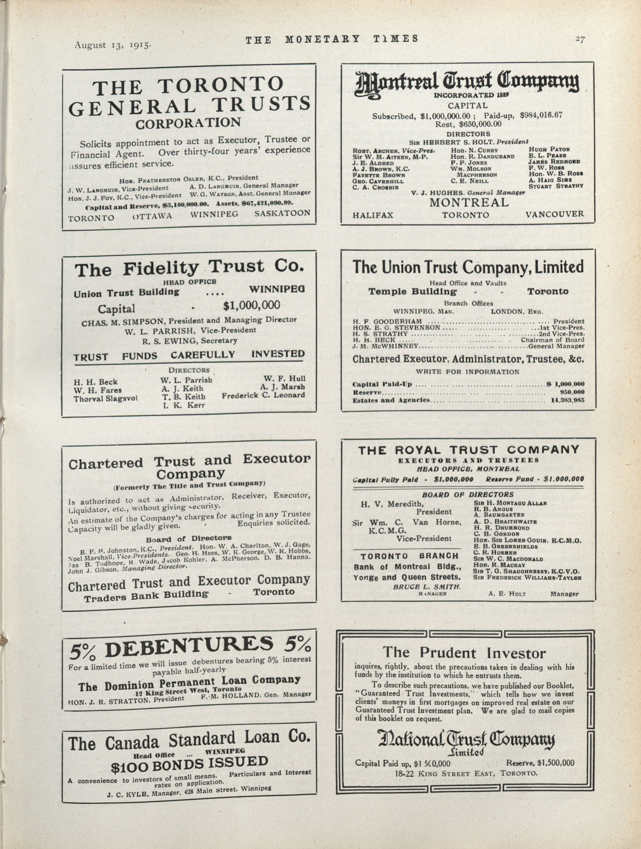 - The Monetary Times, trade review and insurance chronicle. : Volume 55 No. 7 (August 13, 1915)