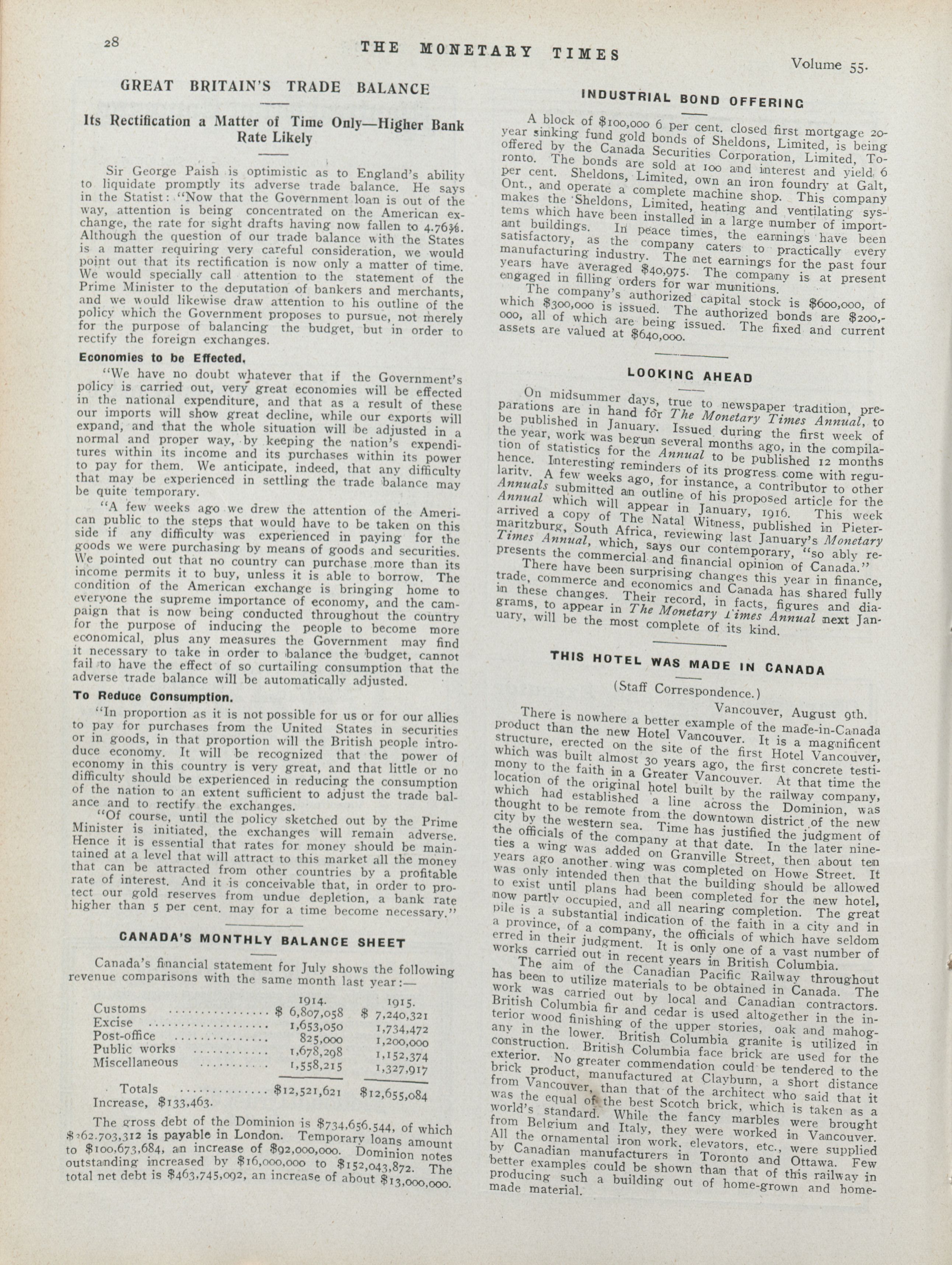 - The Monetary Times, trade review and insurance chronicle. : Volume 55 No. 7 (August 13, 1915)