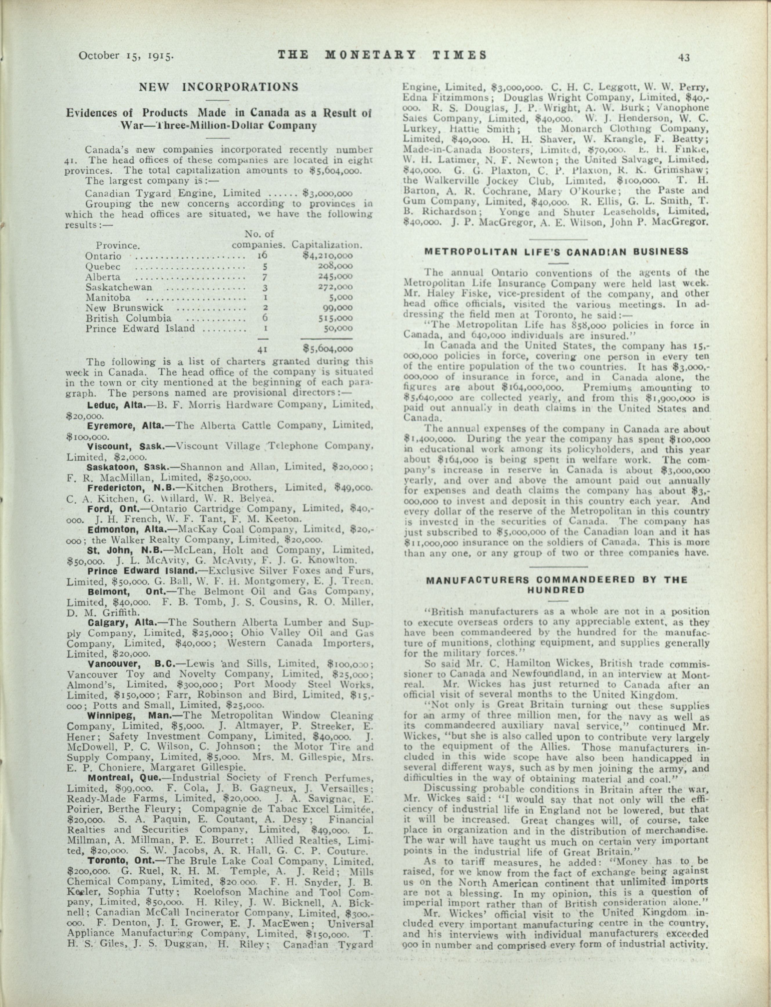The Monetary Times, trade review and insurance chronicle. : Volume 55 No. 16 (October 15, 1915)