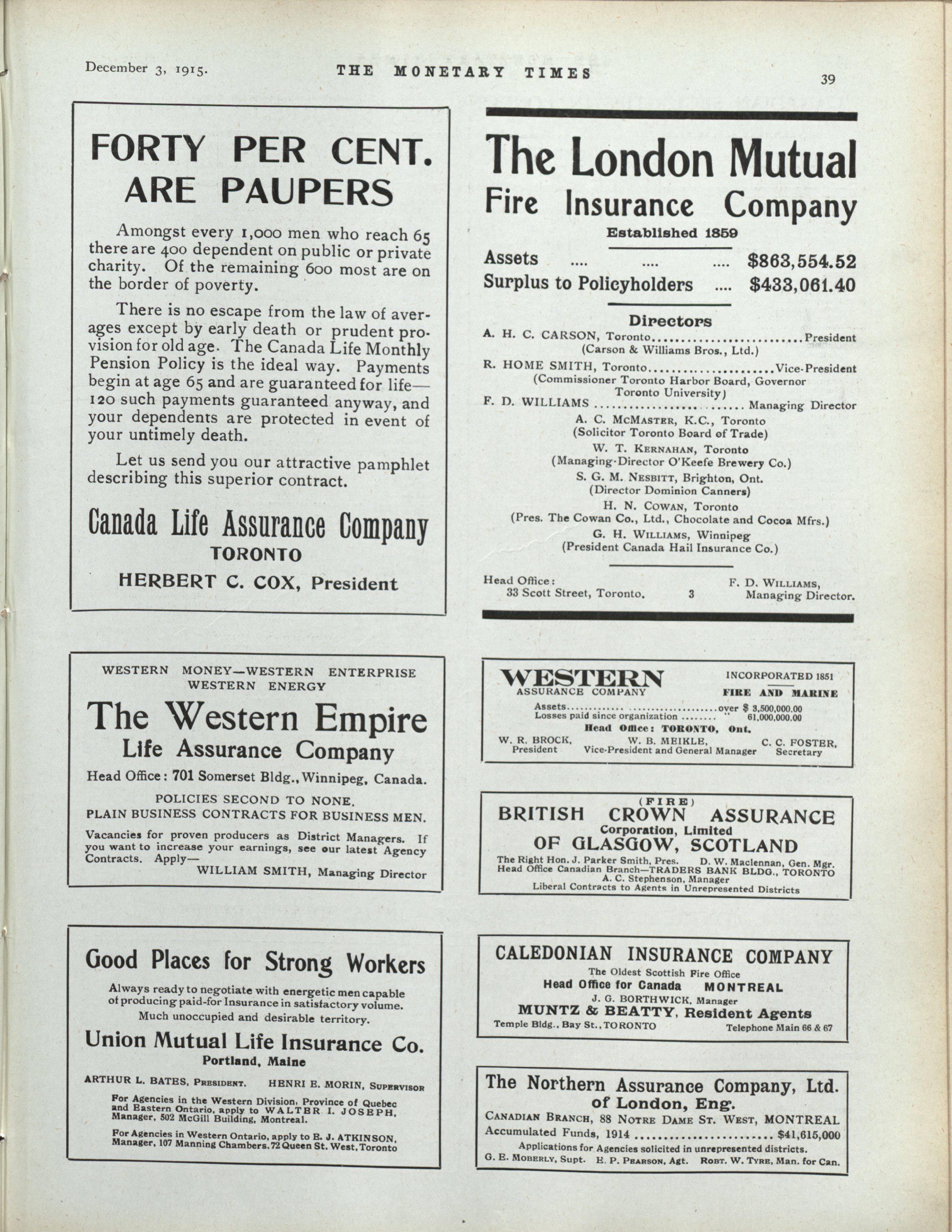 - The Monetary Times, trade review and insurance chronicle. : Volume 55 No. 23 (December 3, 1915)