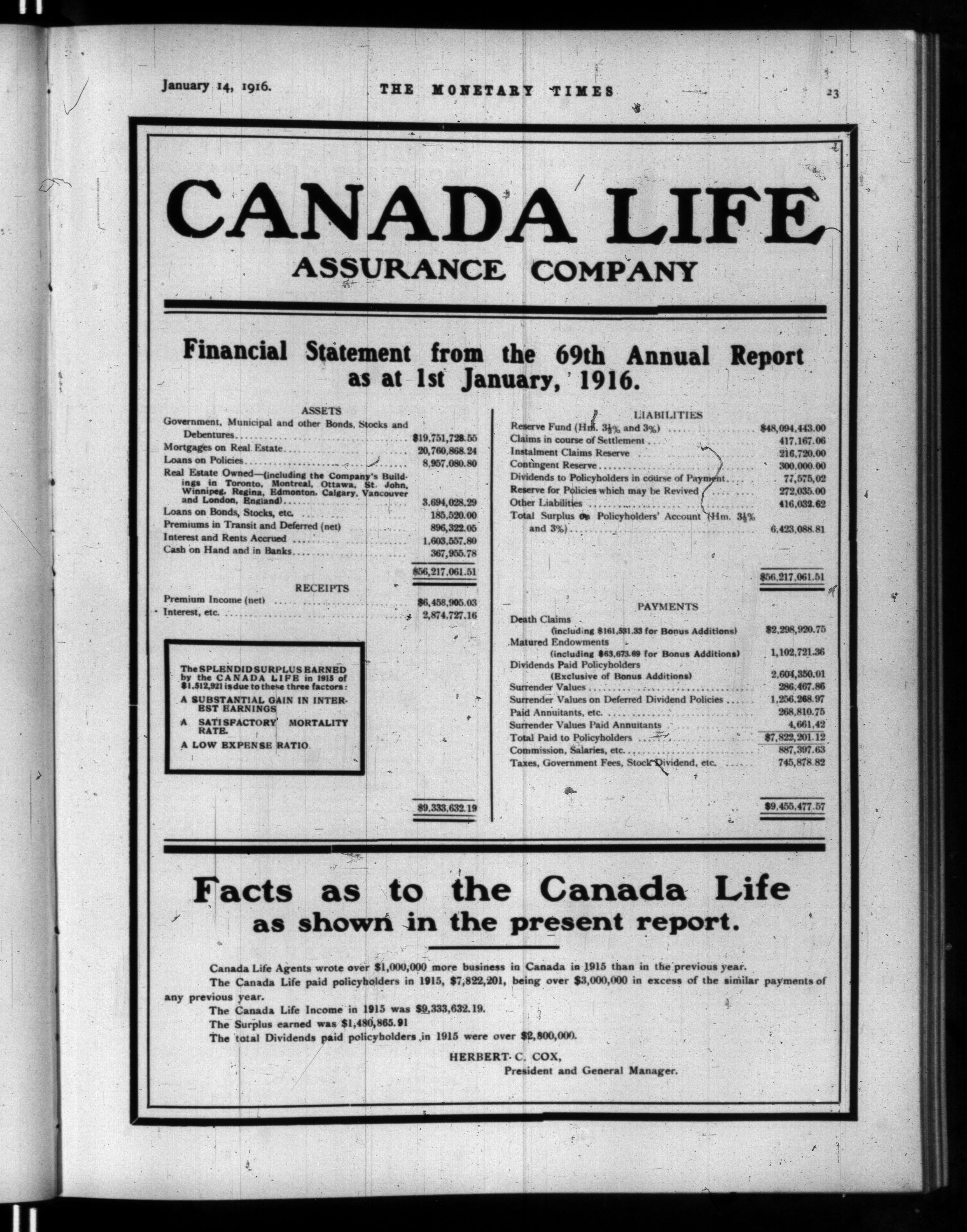 The monetary times, trade review and insurance chronicle : Volume 56, No. 2 (January 14, 1916)