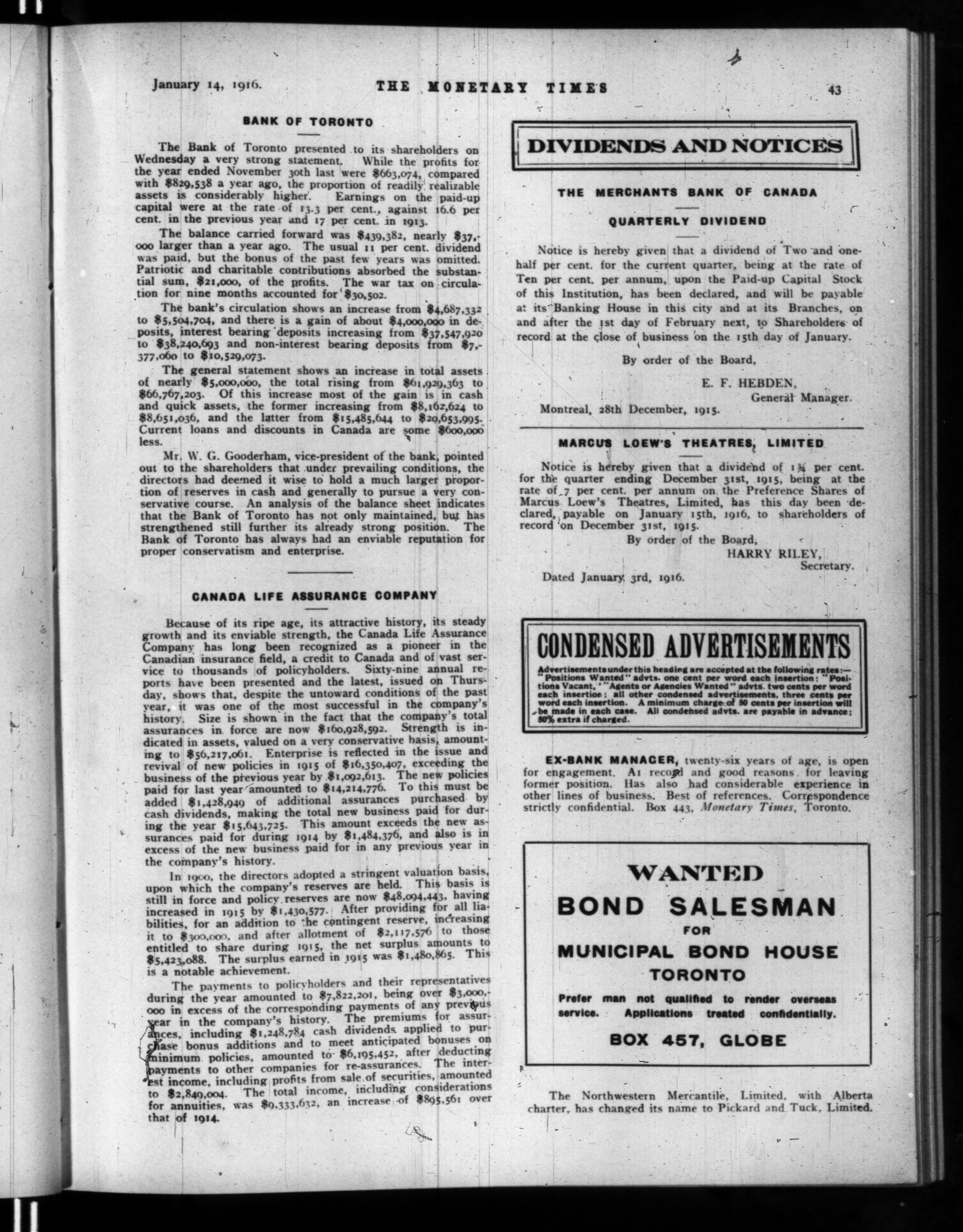 The monetary times, trade review and insurance chronicle : Volume 56, No. 2 (January 14, 1916)