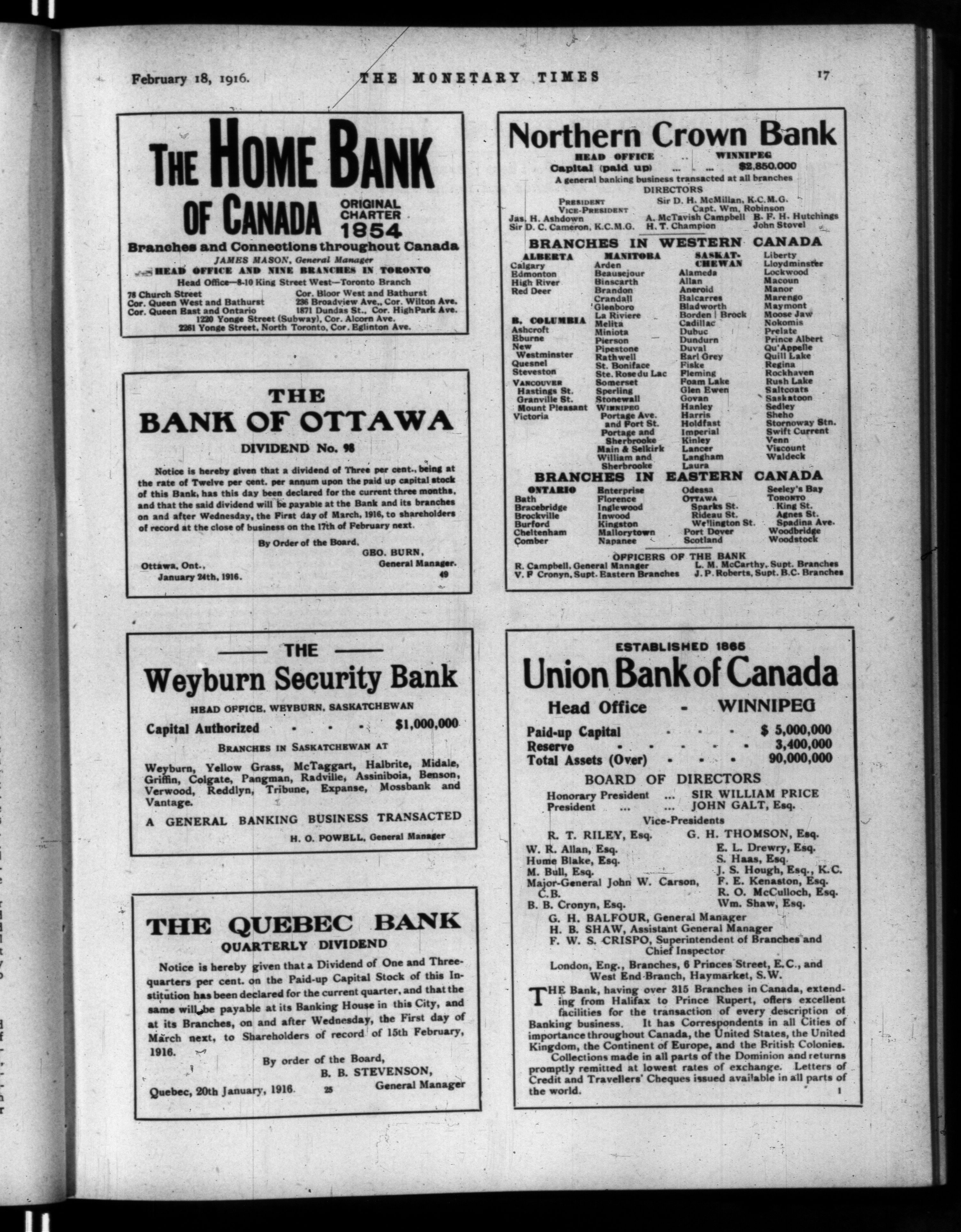 The monetary times, trade review and insurance chronicle : Volume 56, No. 7 (February 18, 1916)