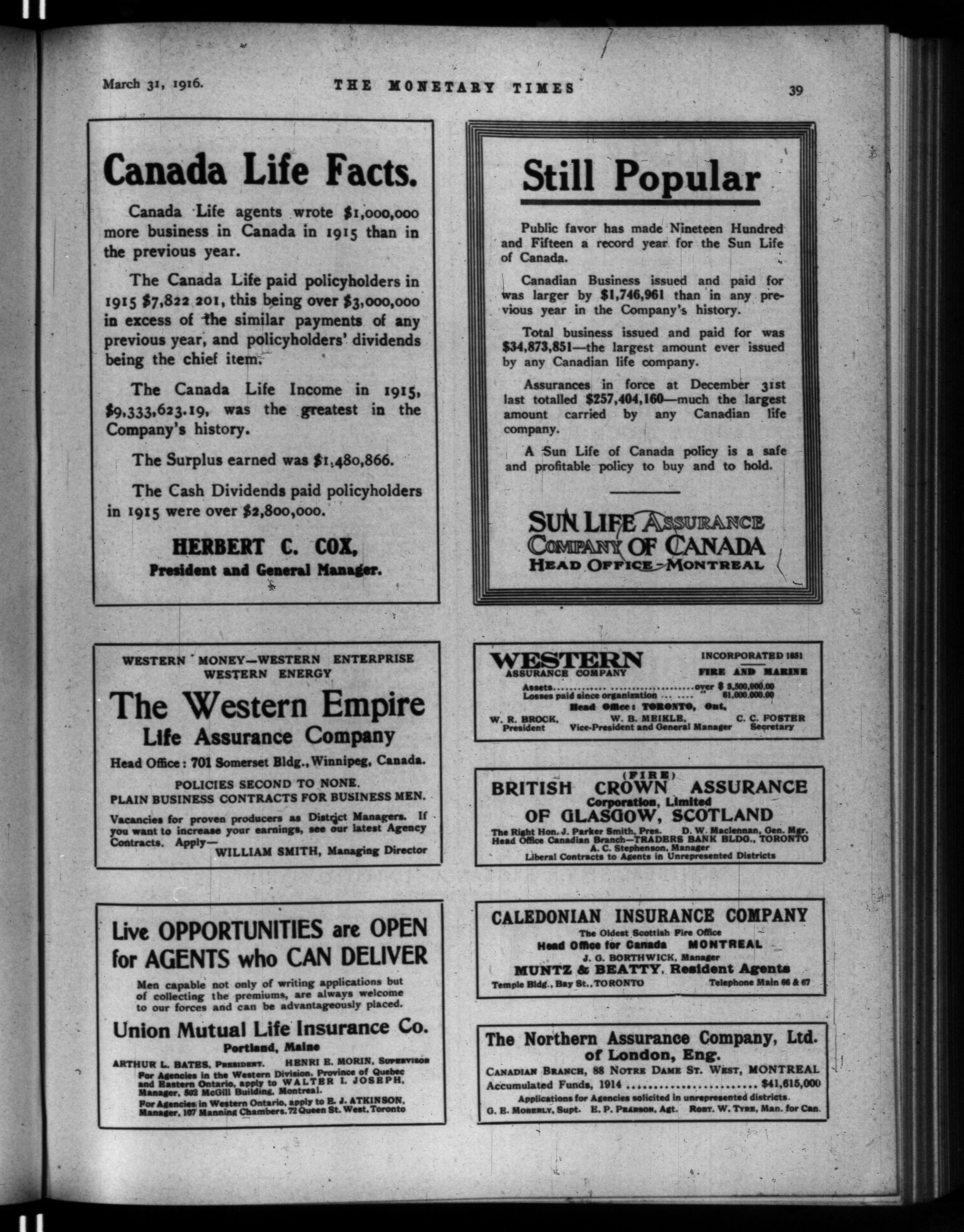 The monetary times, trade review and insurance chronicle : Volume 56, No. 13 (March 31, 1916)