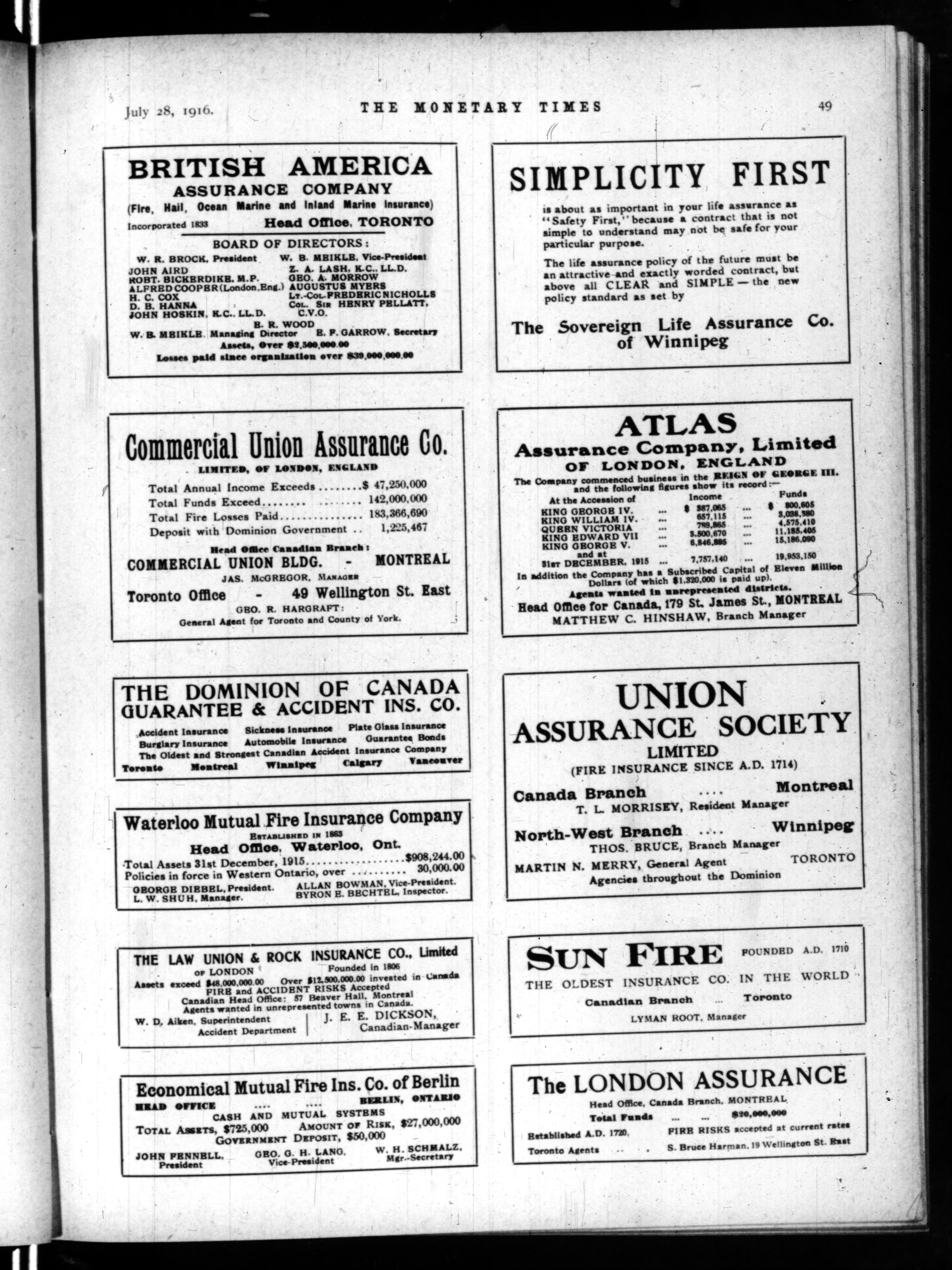 The monetary times, trade review and insurance chronicle : Volume 57, No. 4 (July 28, 1916)