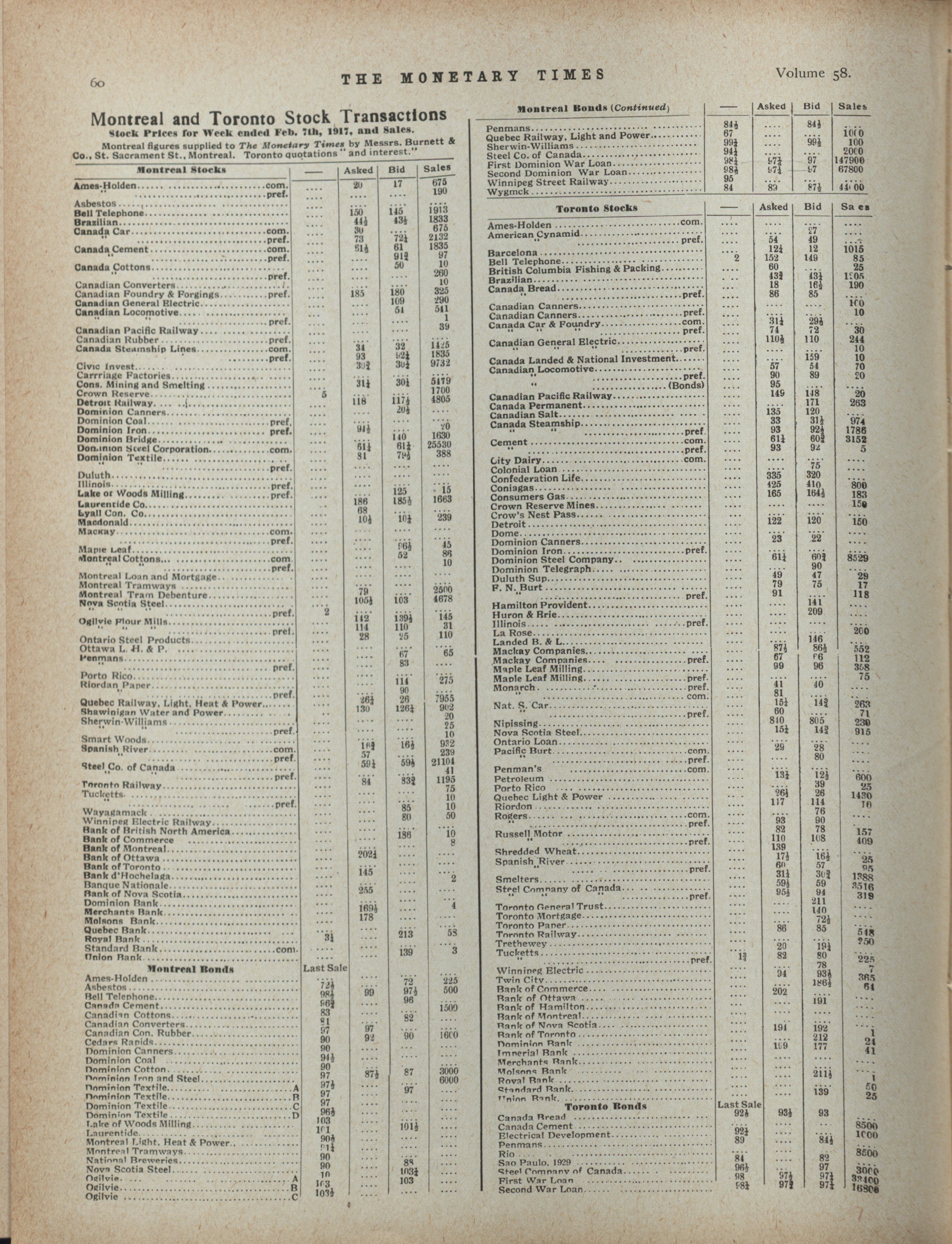 The Monetary Times, trade review and insurance chronicle. : Volume 58 No. 6 (February 9, 1917)