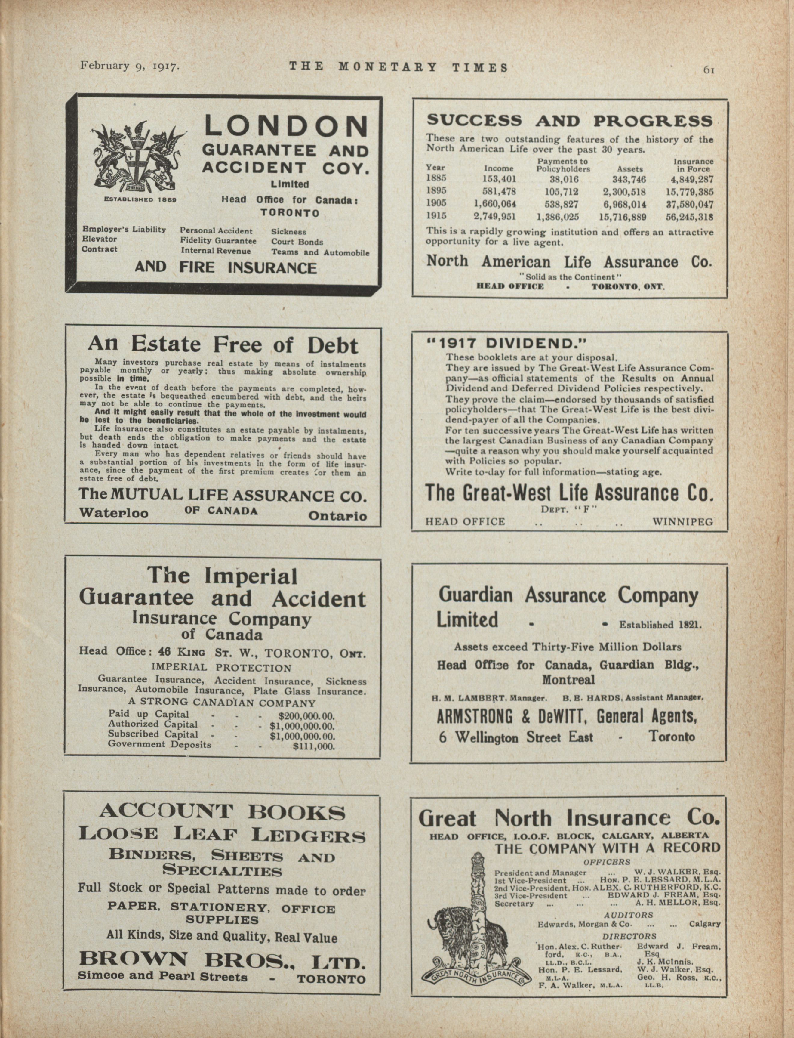 - The Monetary Times, trade review and insurance chronicle. : Volume 58 No. 6 (February 9, 1917)