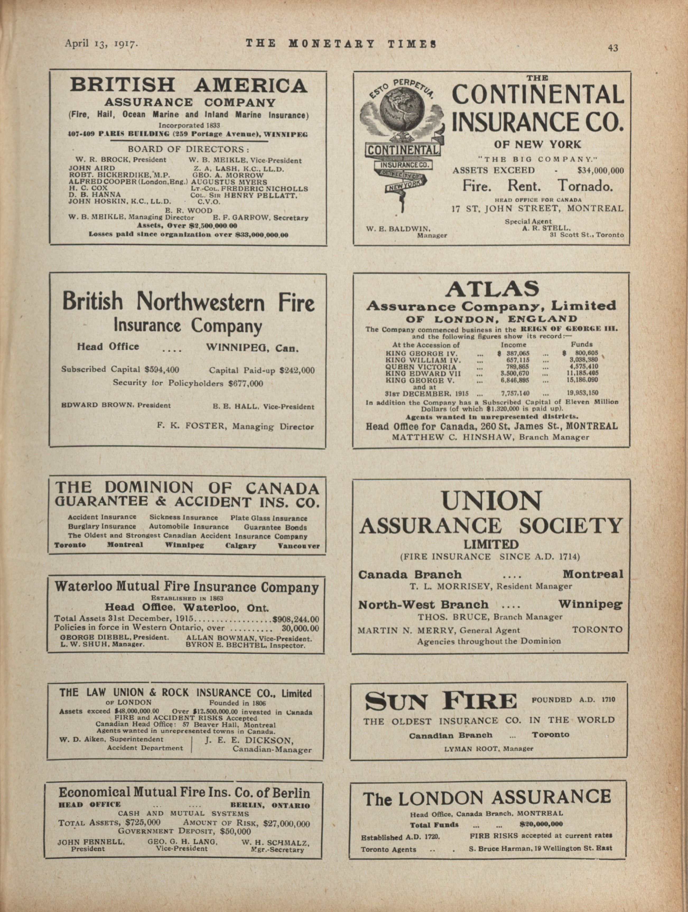 - The Monetary Times, trade review and insurance chronicle. : Volume 58 No. 15 (April 13, 1917)