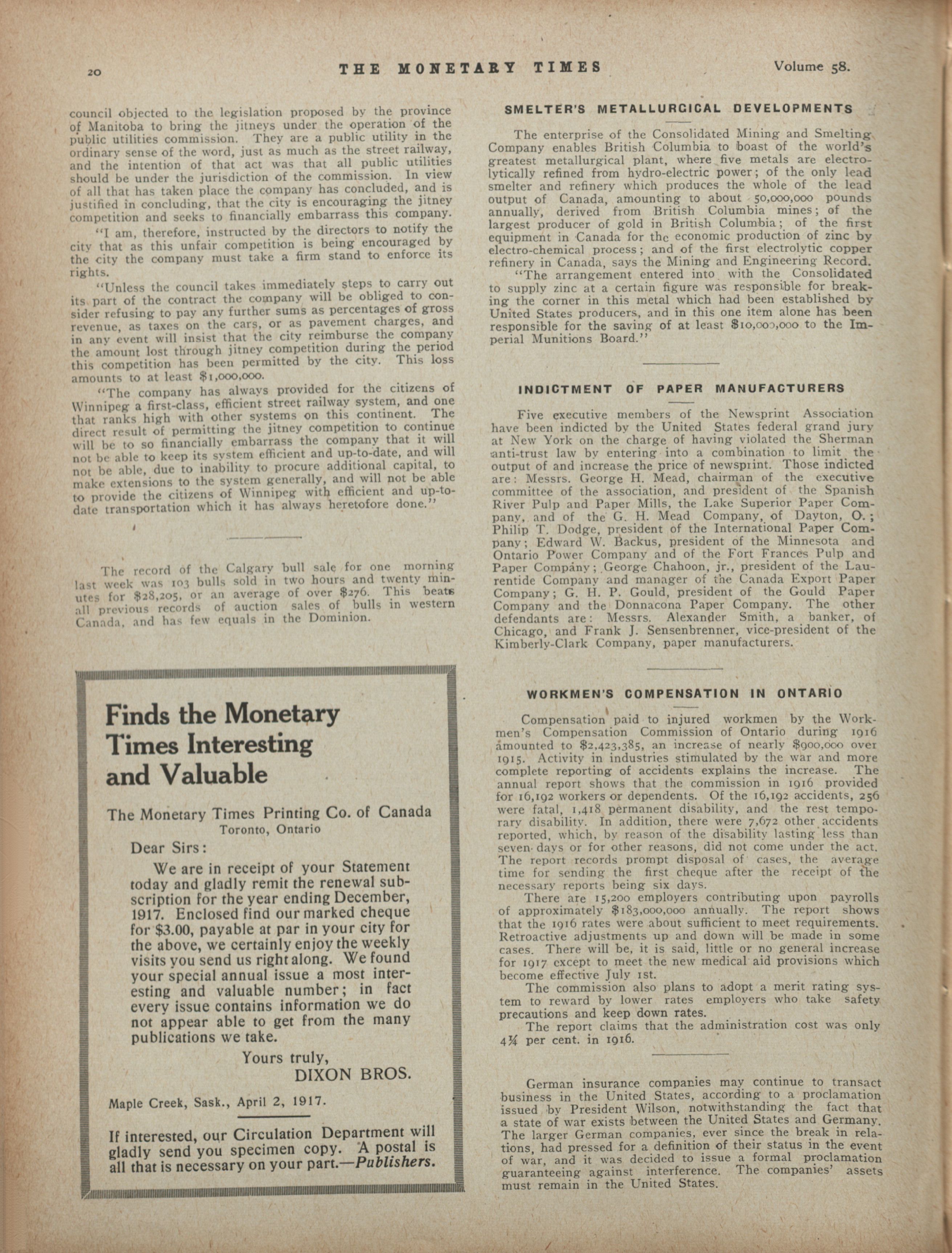The Monetary Times, trade review and insurance chronicle. : Volume 58 No. 16 (April 20, 1917)