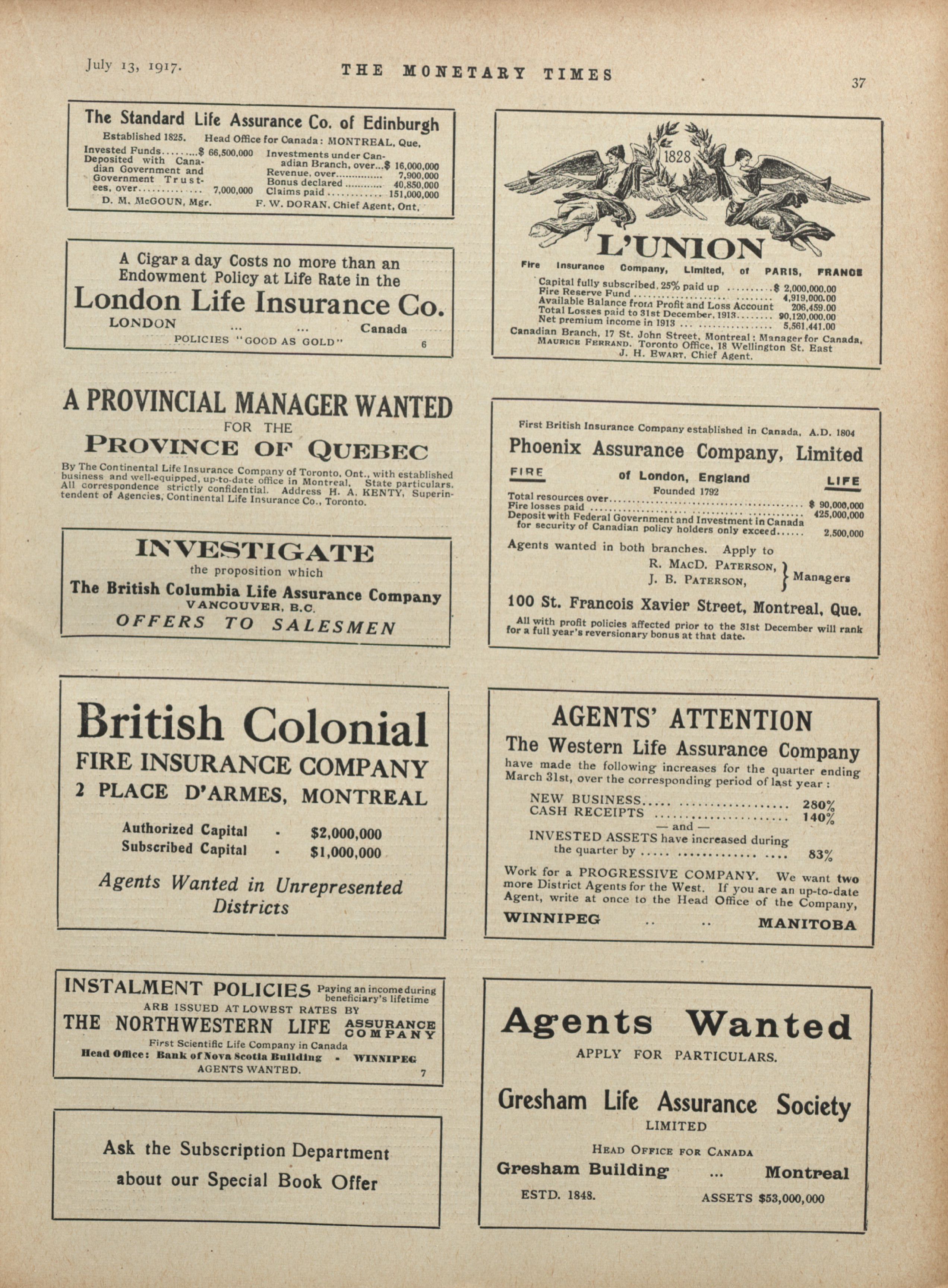 - The Monetary Times, trade review and insurance chronicle. : Volume 59 No. 2 (July 13, 1917)