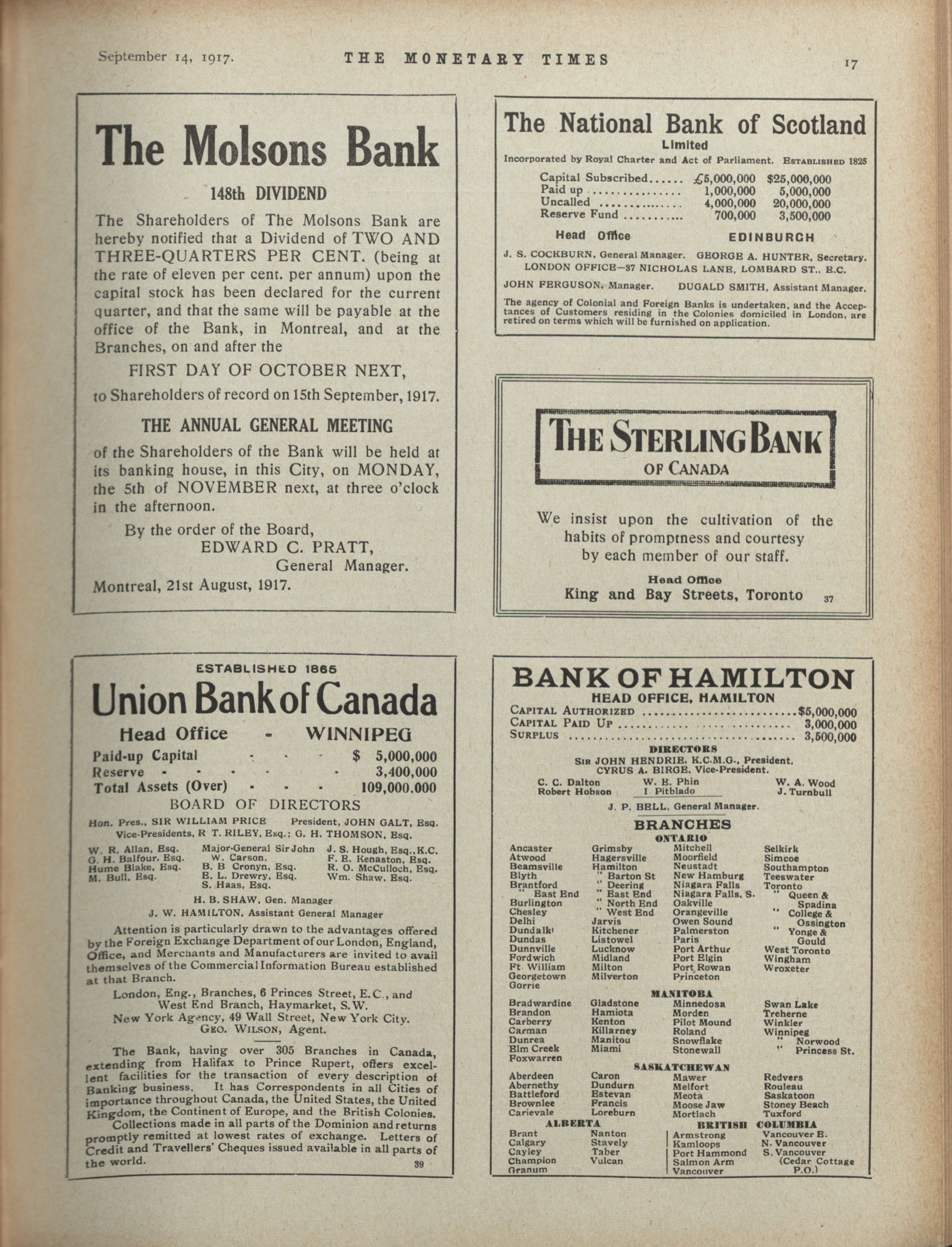 - The Monetary Times, trade review and insurance chronicle. : Volume 59 No. 11 (September 14, 1917)