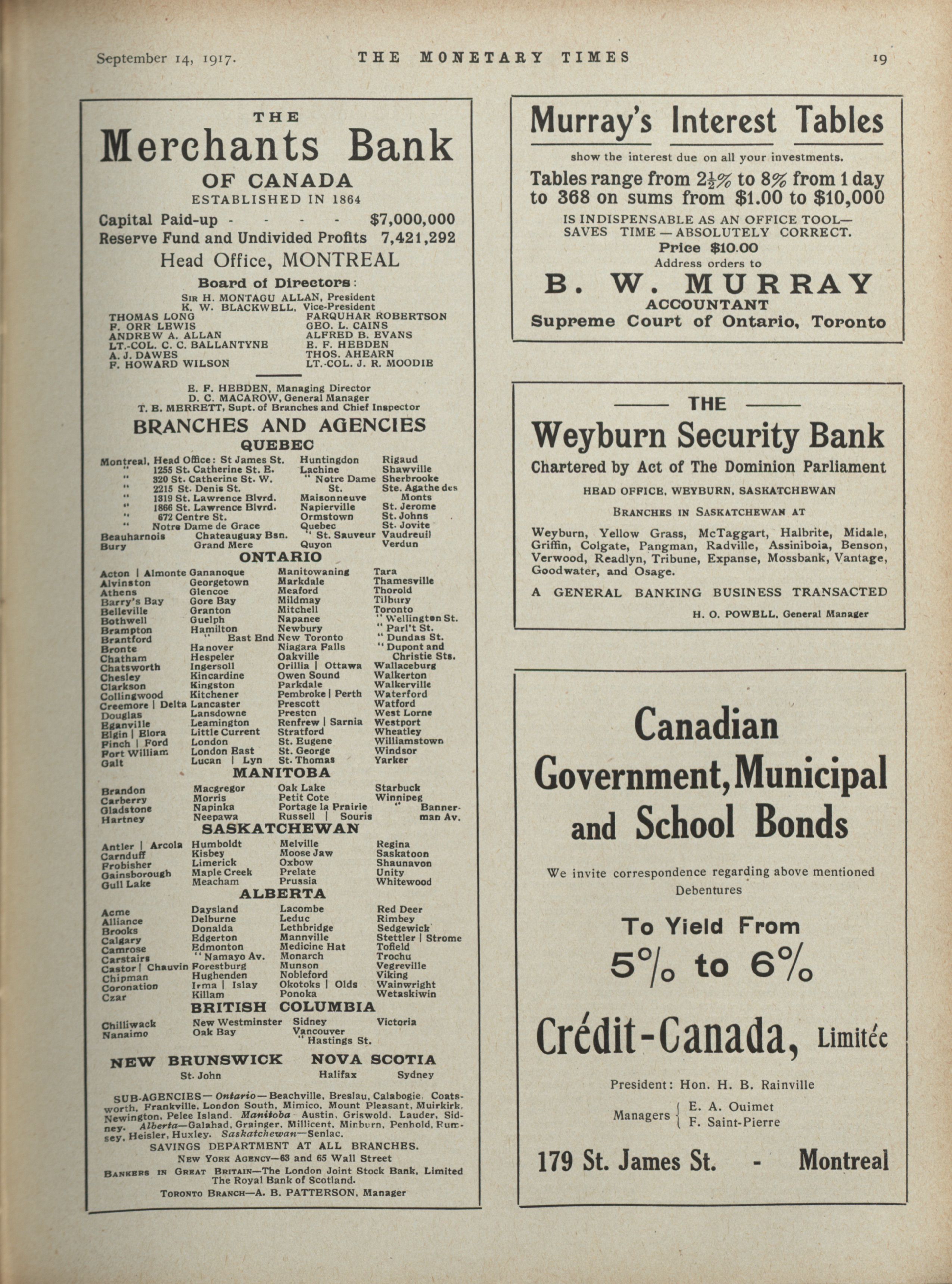 - The Monetary Times, trade review and insurance chronicle. : Volume 59 No. 11 (September 14, 1917)