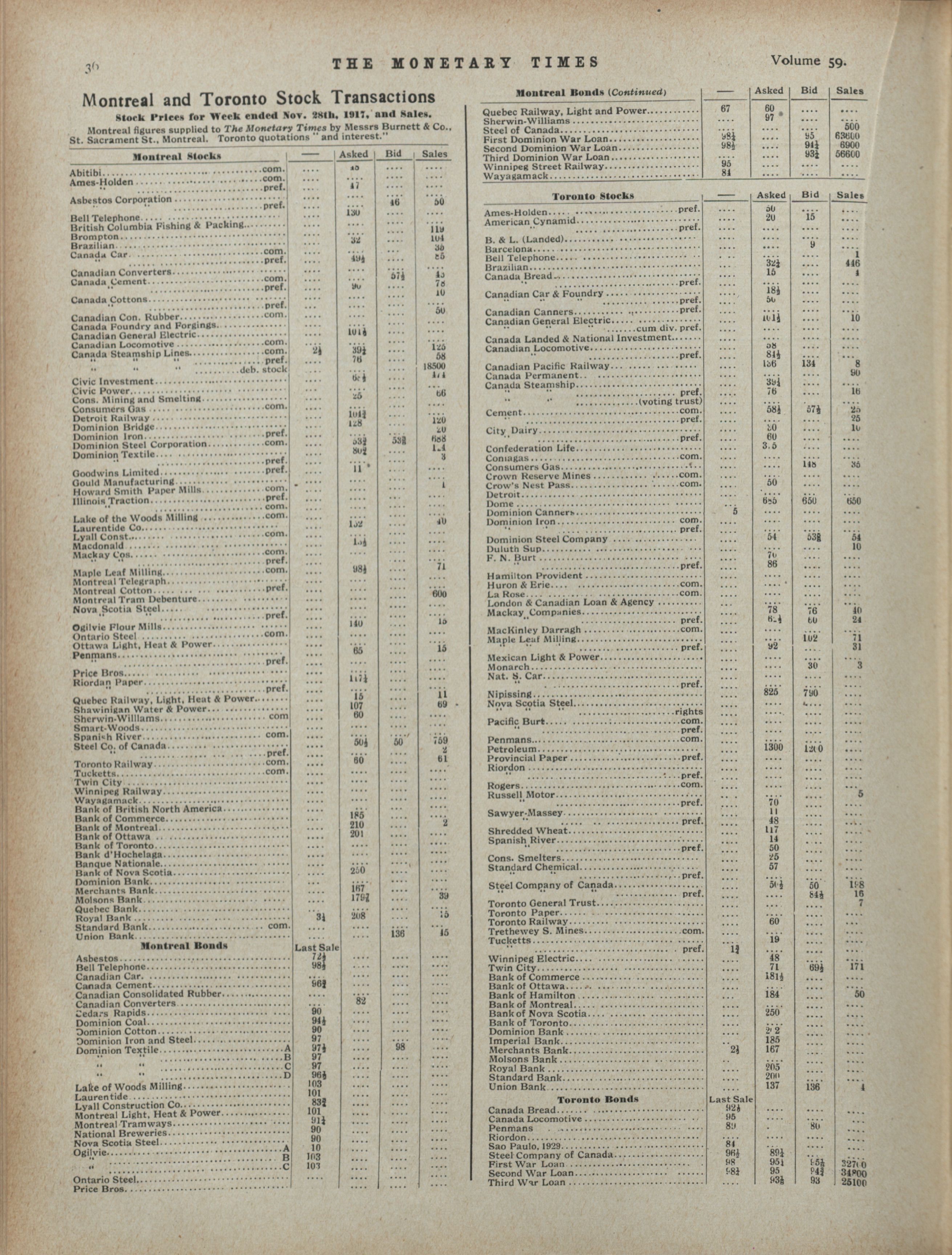- The Monetary Times, trade review and insurance chronicle. : Volume 59 No. 22 (November 30, 1917)