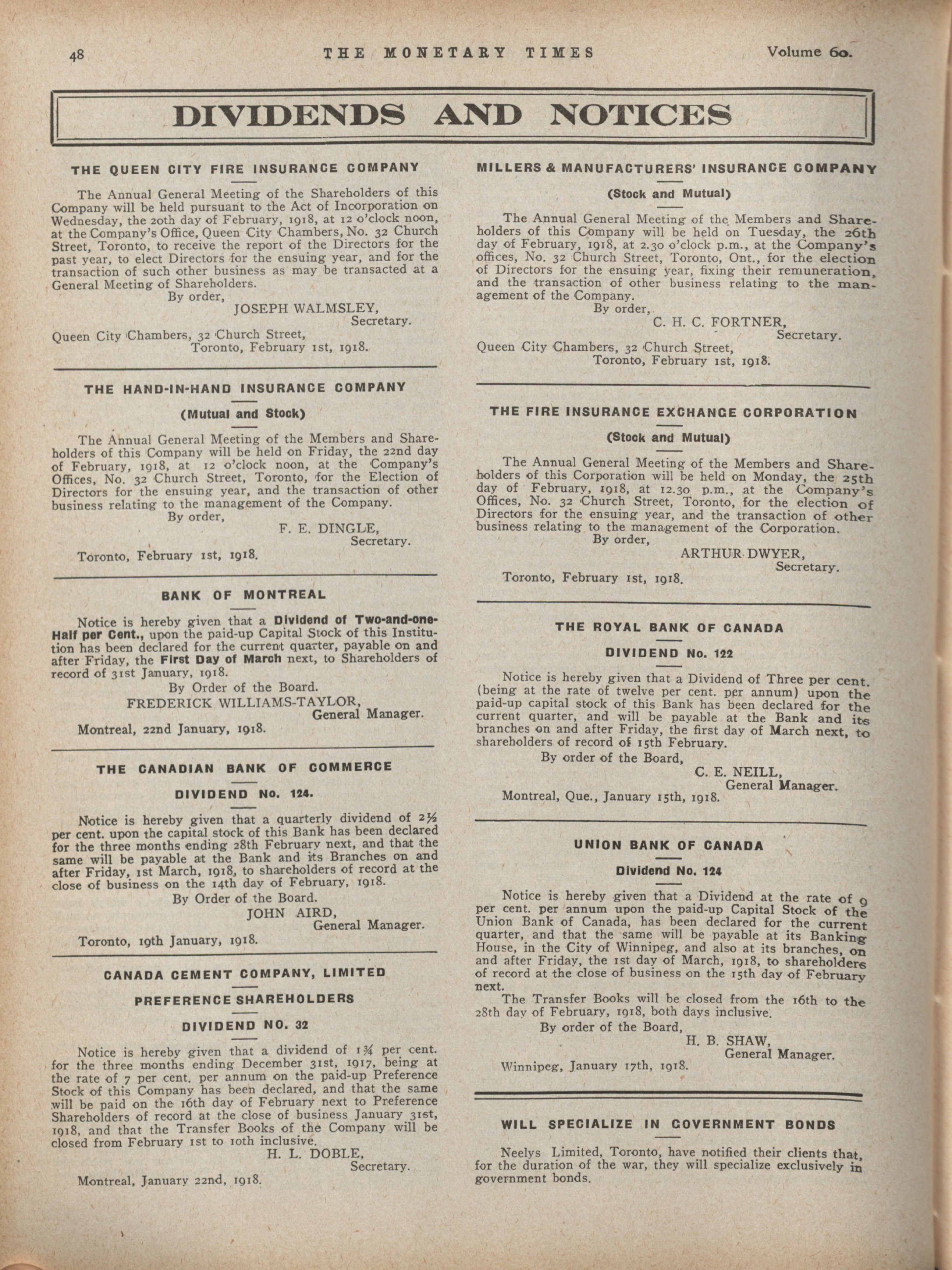 - The Monetary Times, trade review and insurance chronicle. : Volume 60 No. 5 (February 1, 1918)