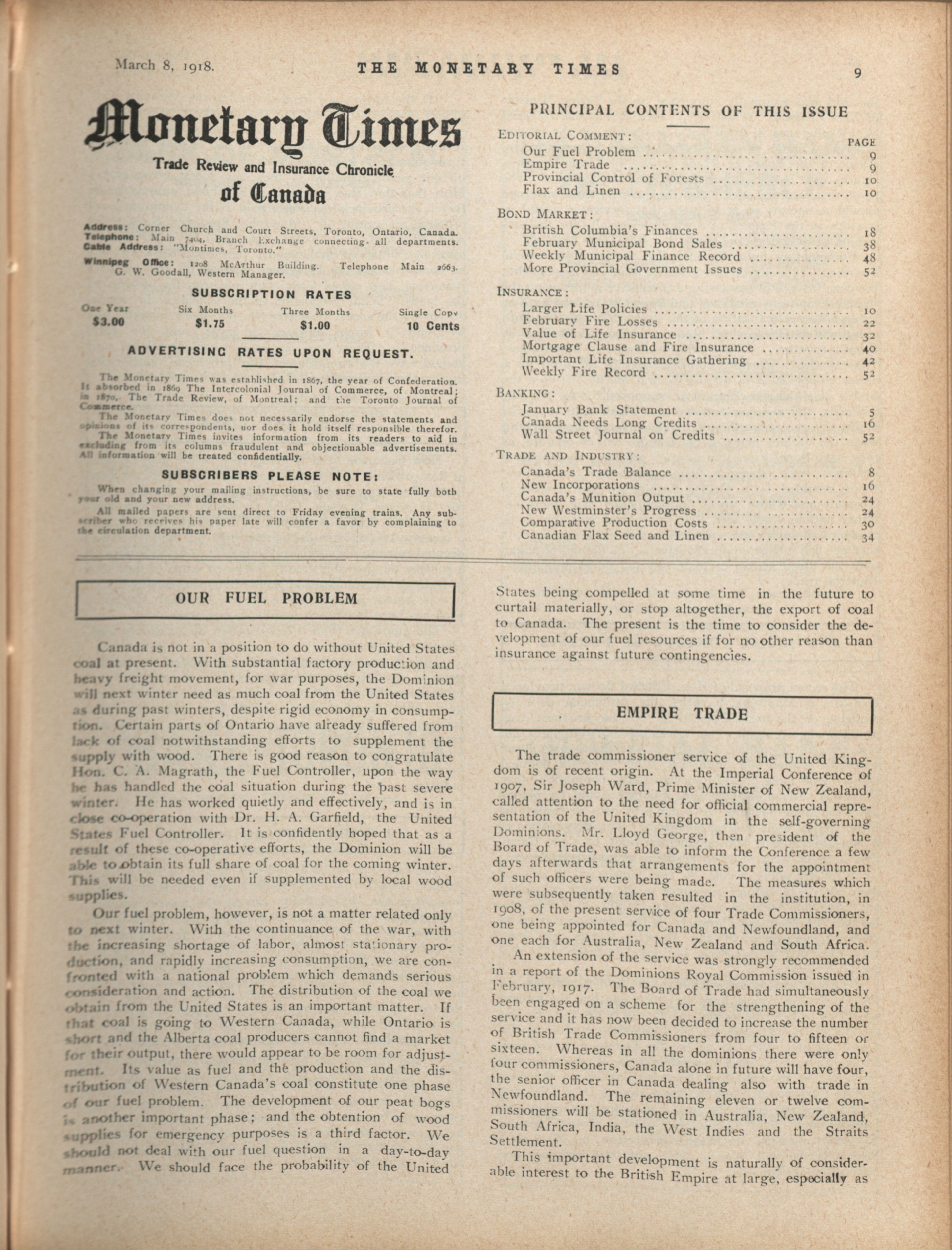 - The Monetary Times, trade review and insurance chronicle. : Volume 60 No. 10 (March 8, 1918)