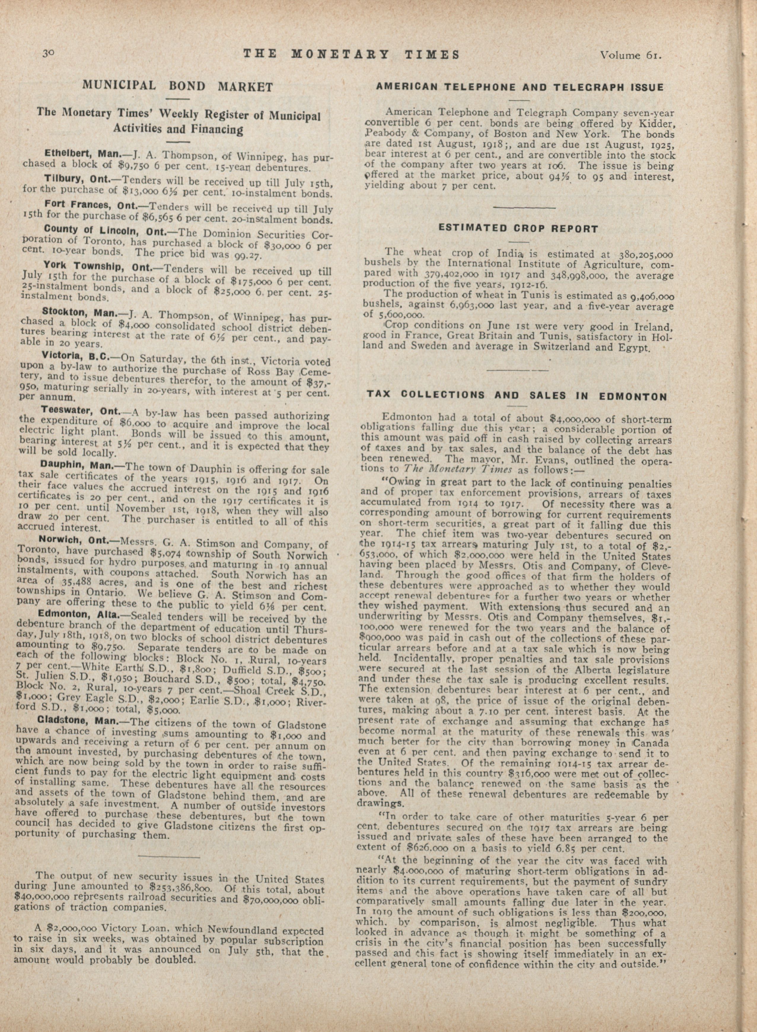 - The Monetary Times, trade review and insurance chronicle. : Volume 61 No. 2 (July 12, 1918)