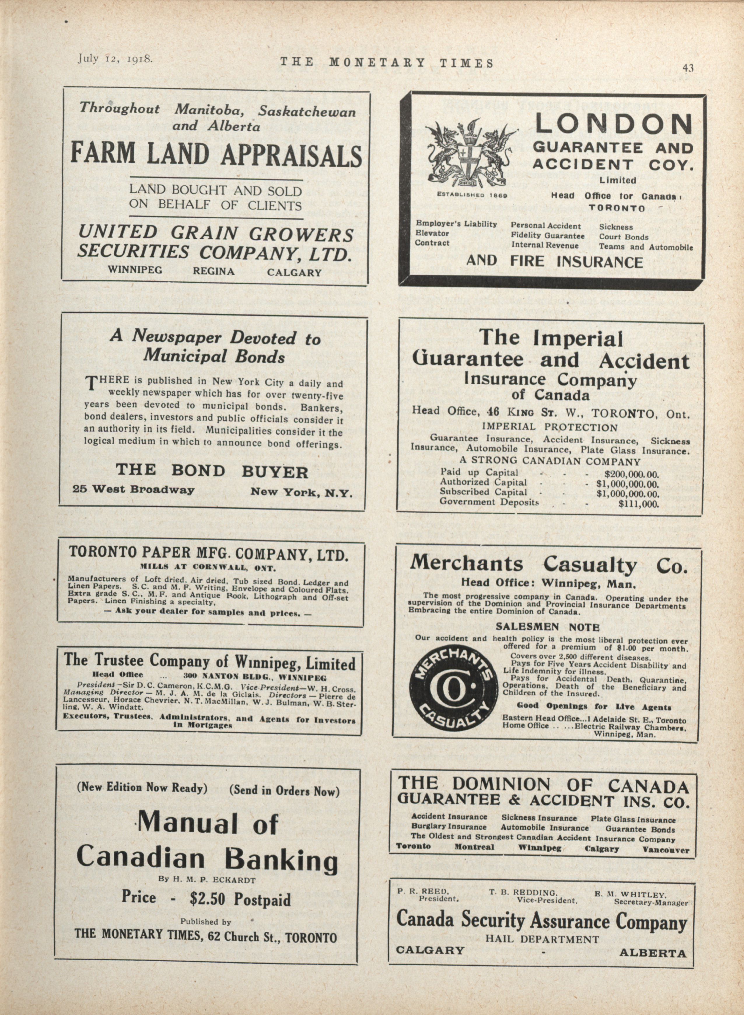- The Monetary Times, trade review and insurance chronicle. : Volume 61 No. 2 (July 12, 1918)