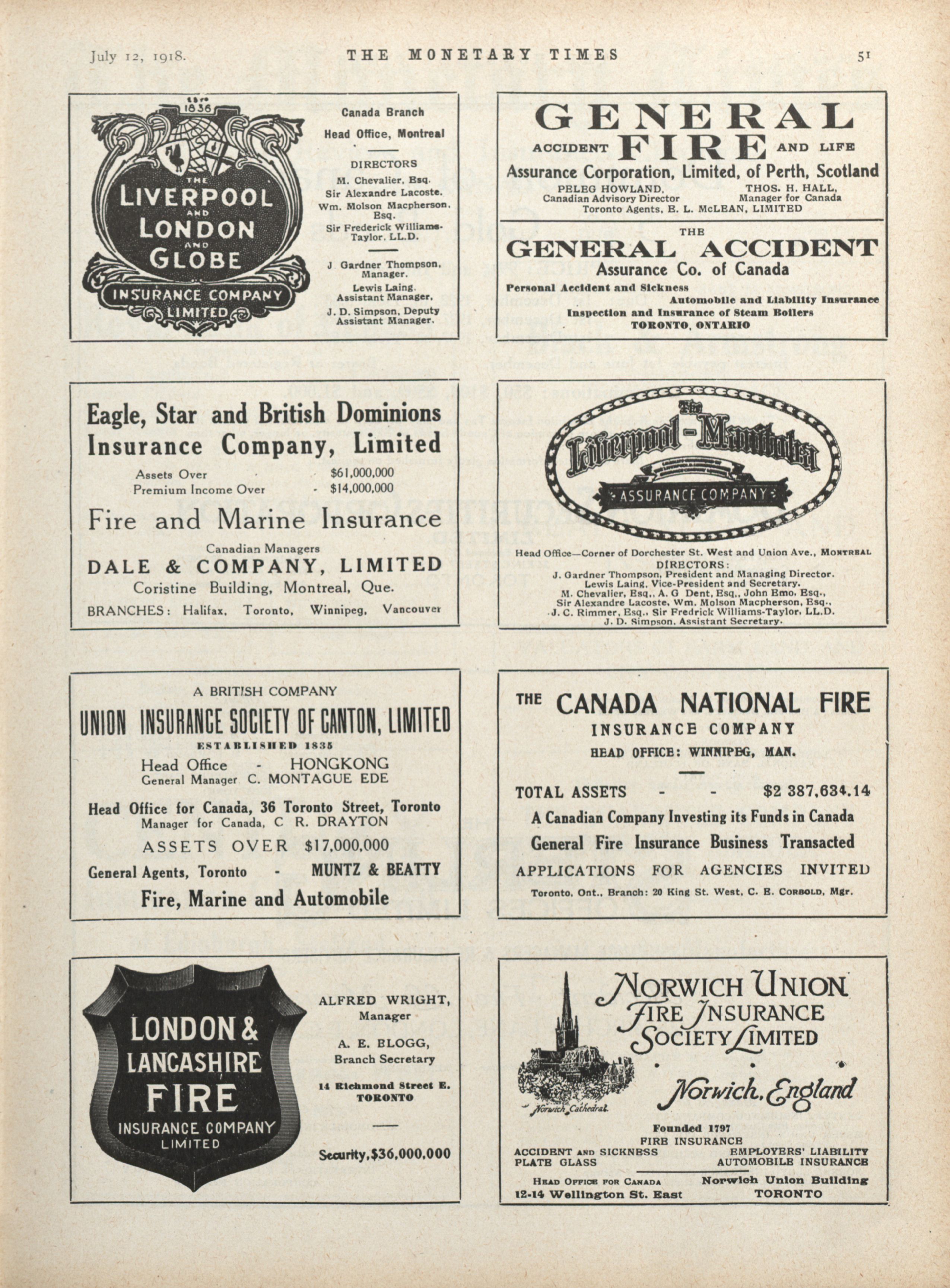 - The Monetary Times, trade review and insurance chronicle. : Volume 61 No. 2 (July 12, 1918)