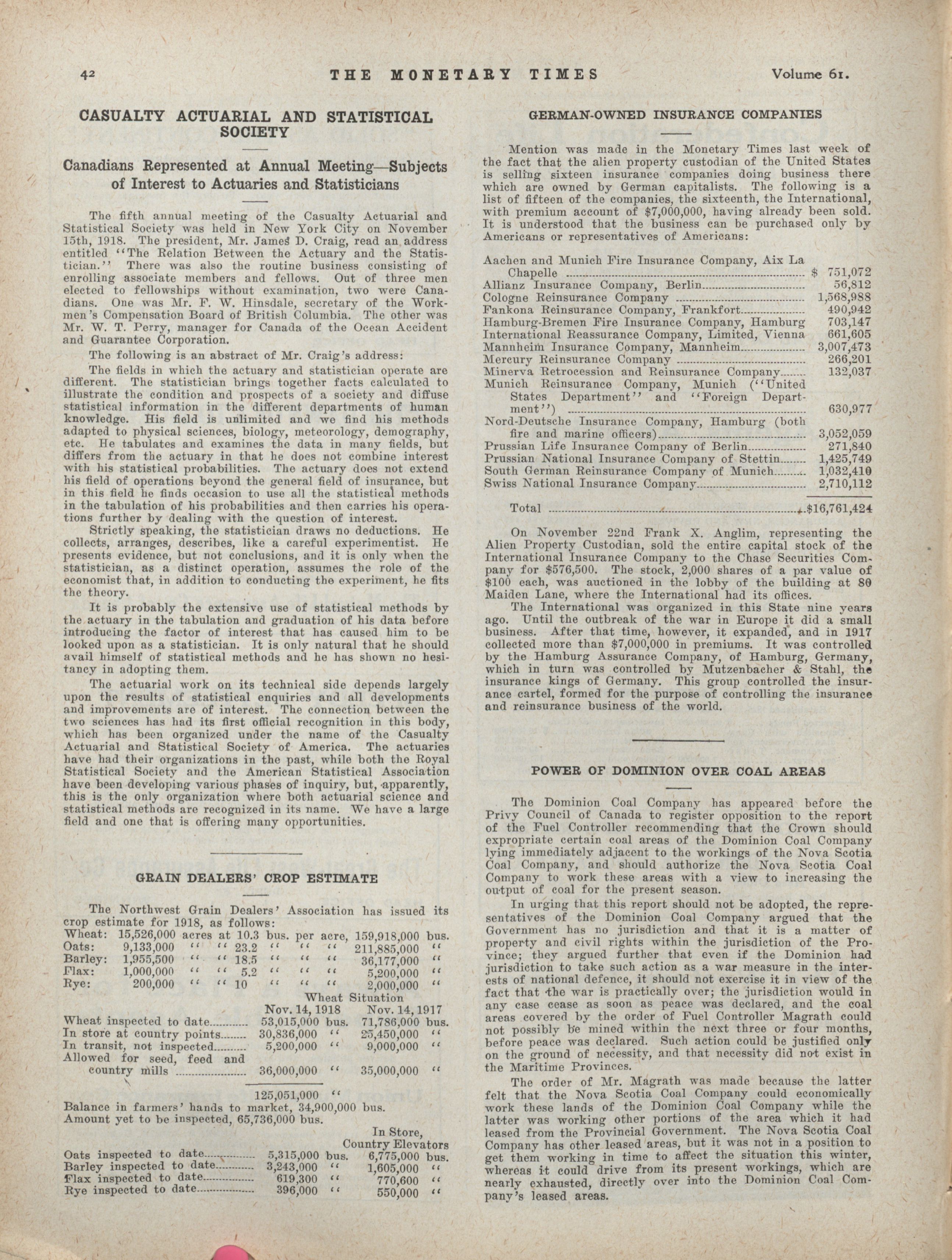 - The Monetary Times, trade review and insurance chronicle. : Volume 61 No. 22 (November 29, 1918)