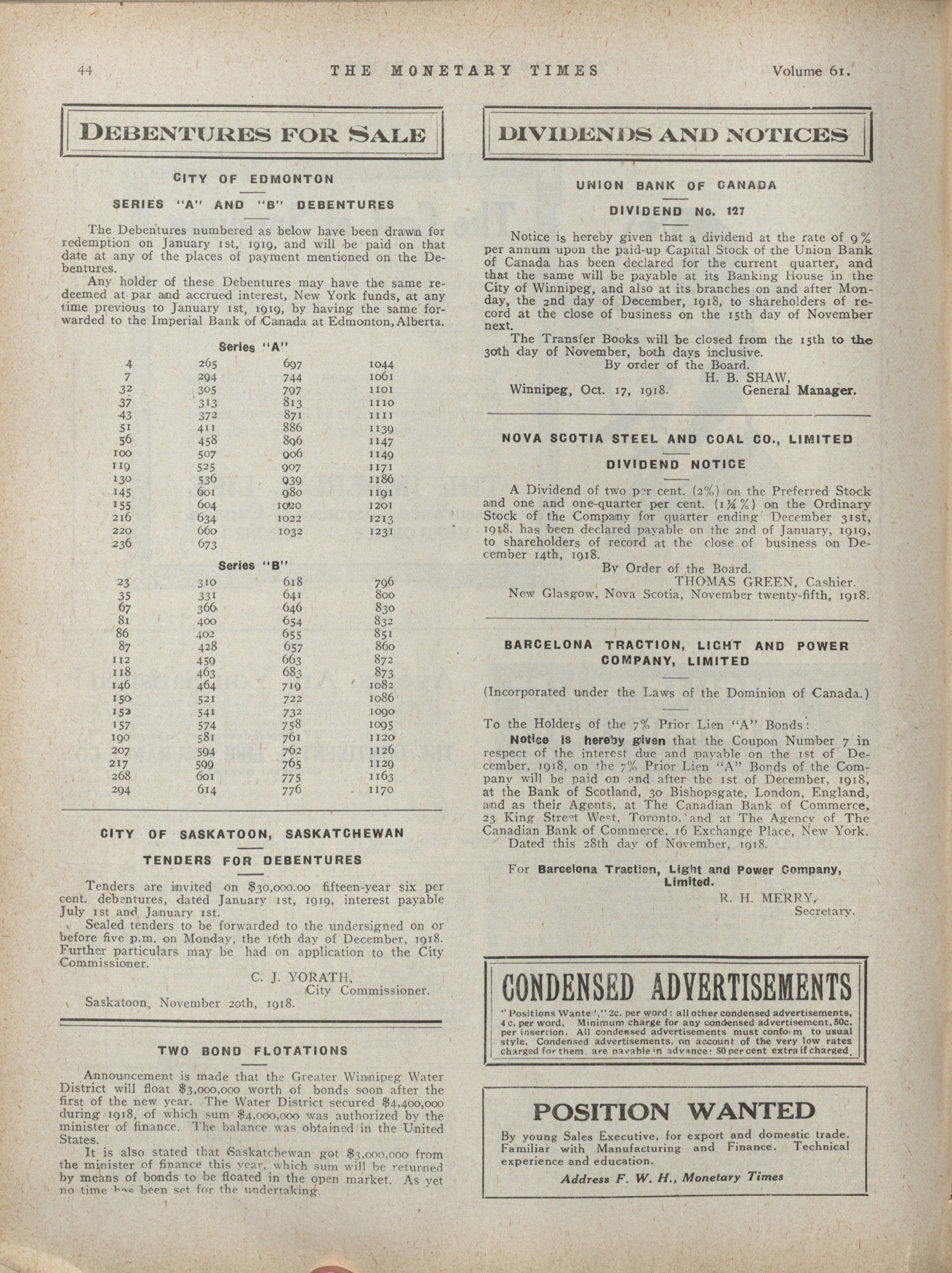 - The Monetary Times, trade review and insurance chronicle. : Volume 61 No. 22 (November 29, 1918)