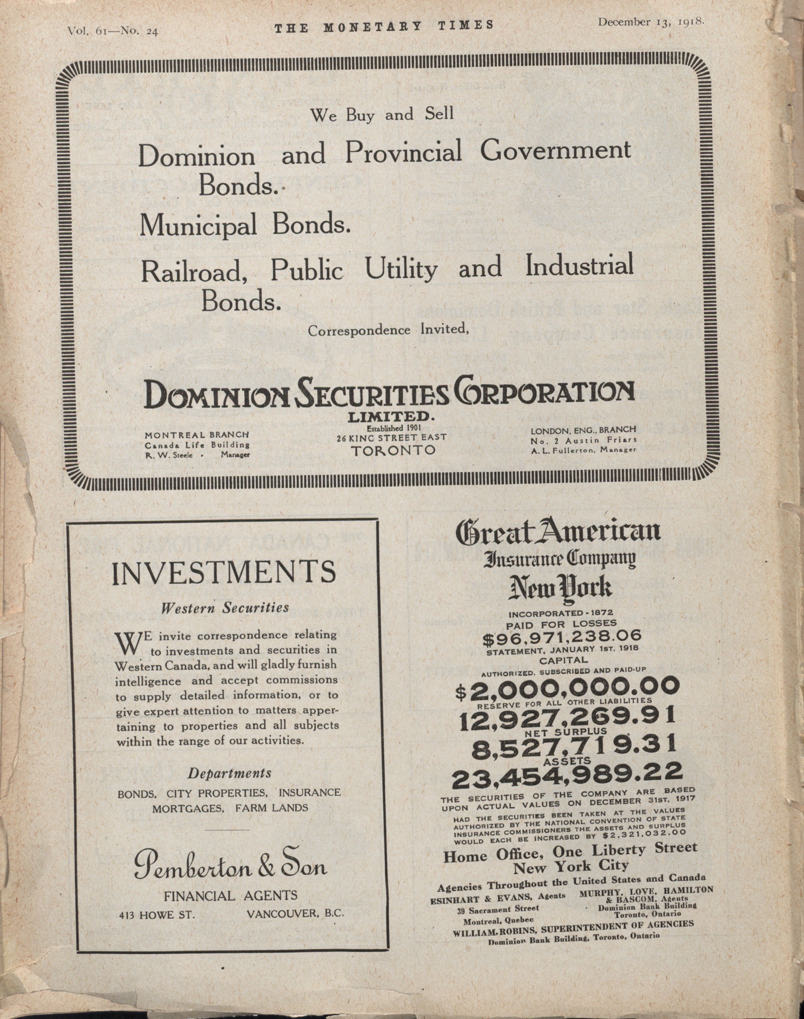 The Monetary Times, trade review and insurance chronicle. : Volume 61 No. 24 (December 13, 1918)