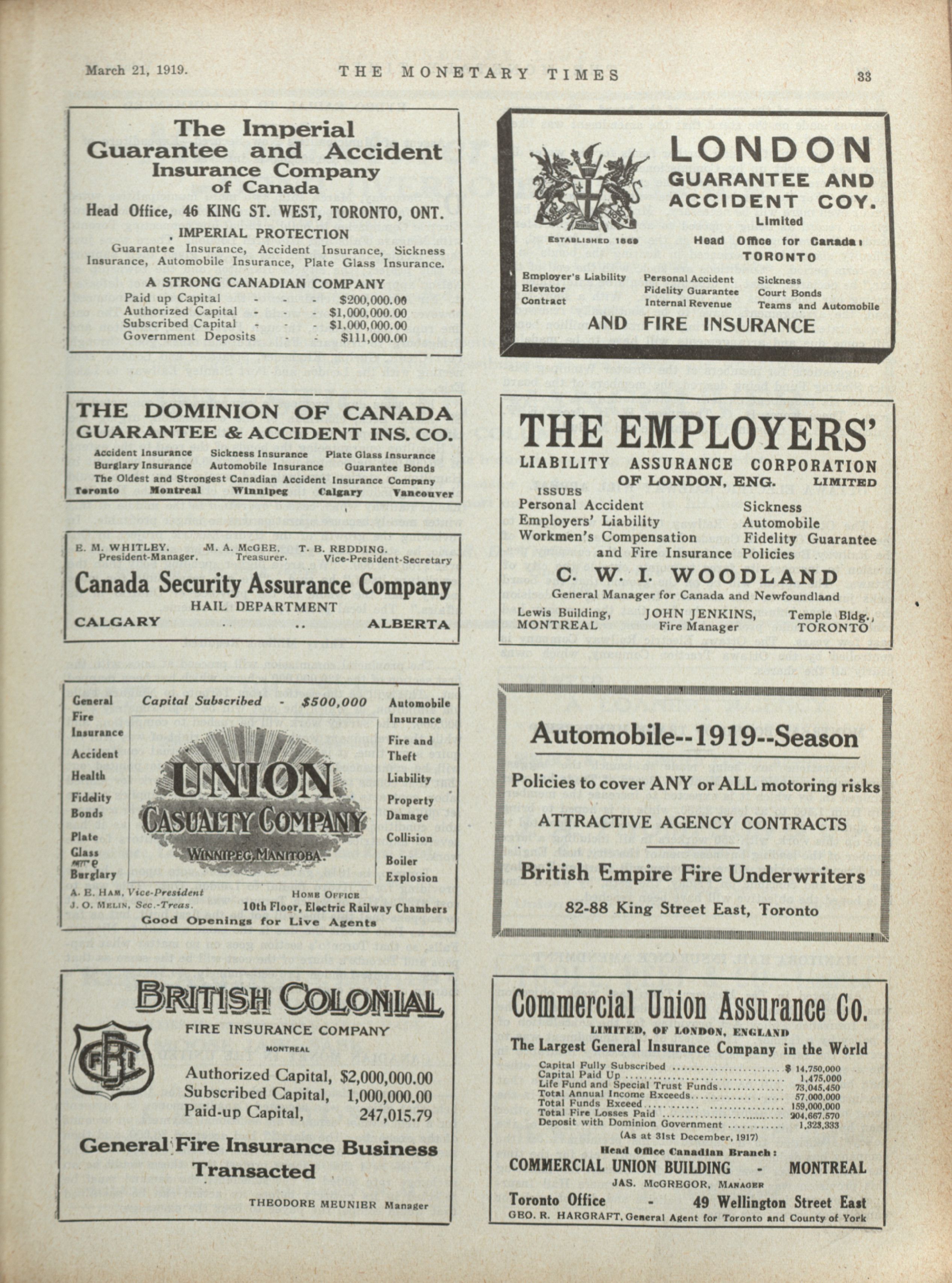- The Monetary Times, trade review and insurance chronicle. : Volume 62 No. 12 (March 21, 1919)