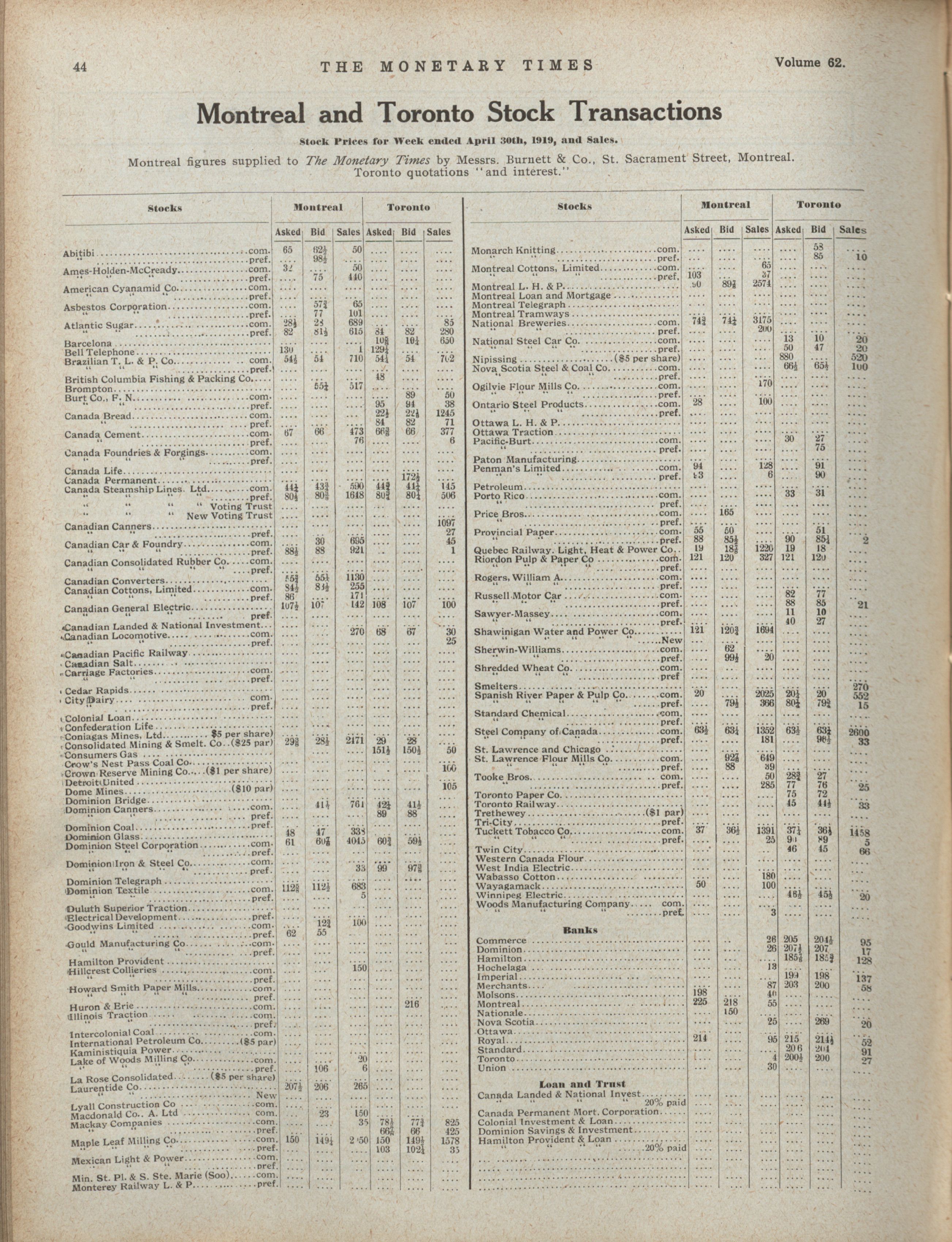 - The Monetary Times, trade review and insurance chronicle. : Volume 62 No. 18 (May 2, 1919)