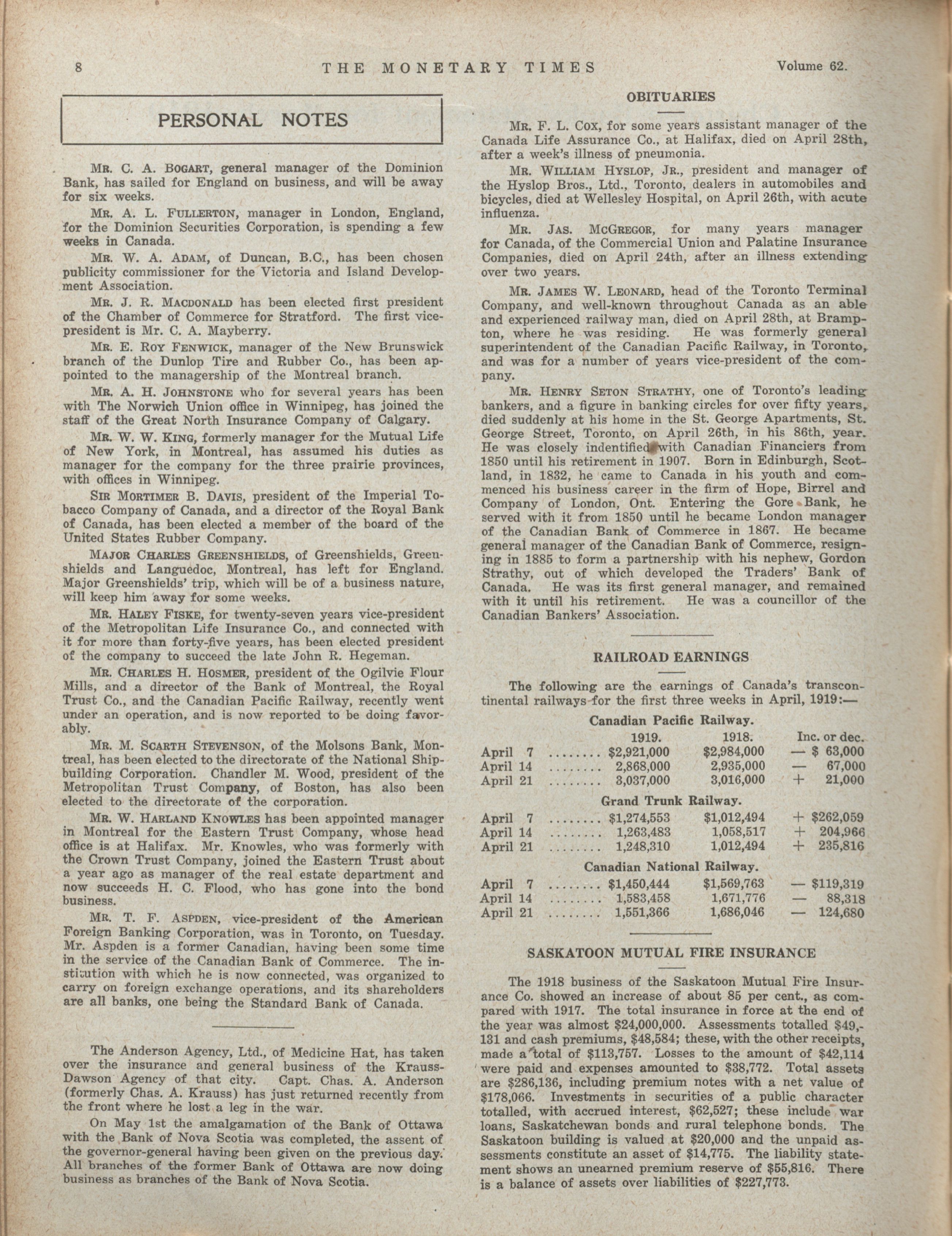 - The Monetary Times, trade review and insurance chronicle. : Volume 62 No. 18 (May 2, 1919)