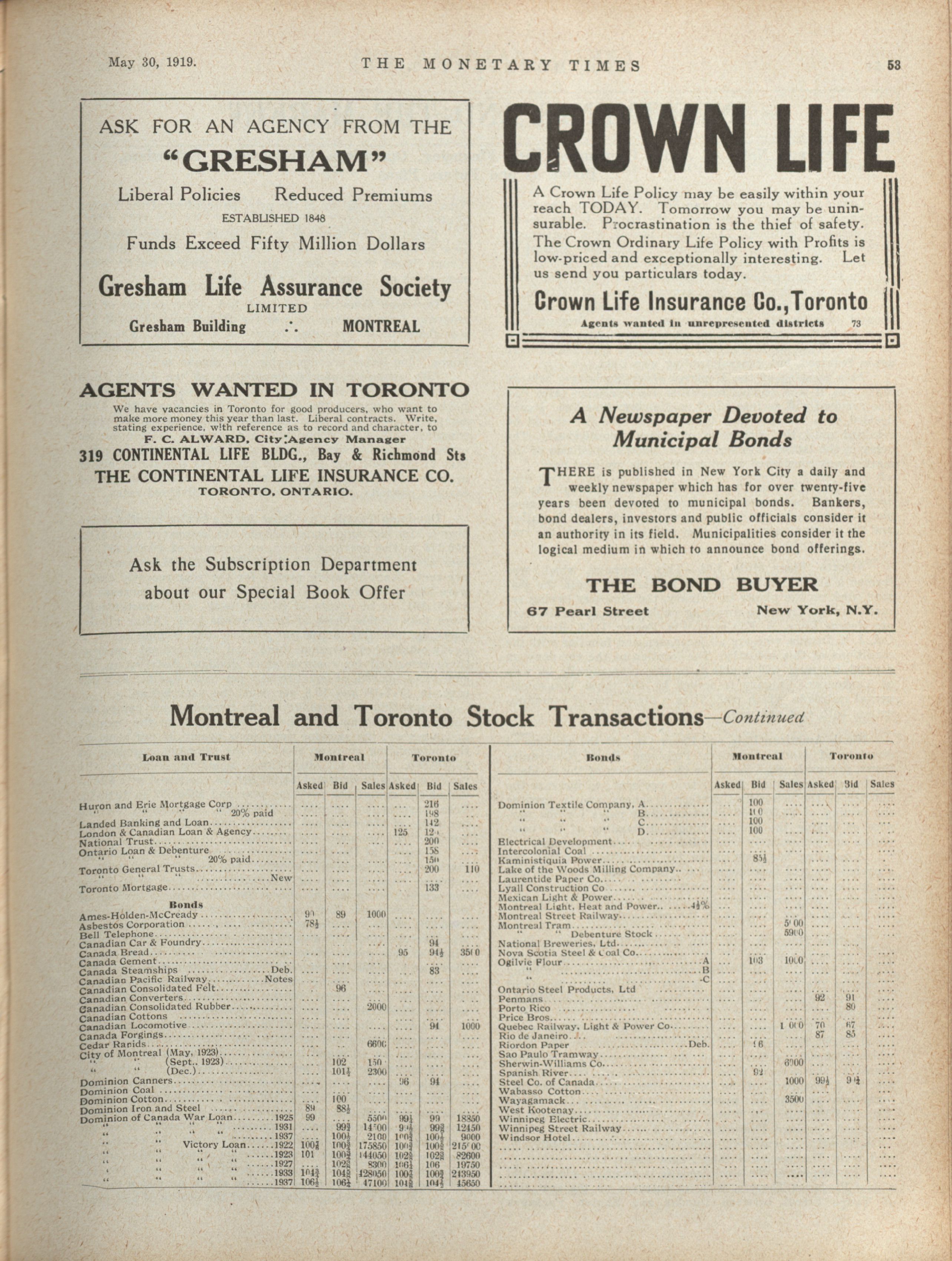 The Monetary Times, trade review and insurance chronicle. : Volume 62 No. 22 (May 30, 1919)
