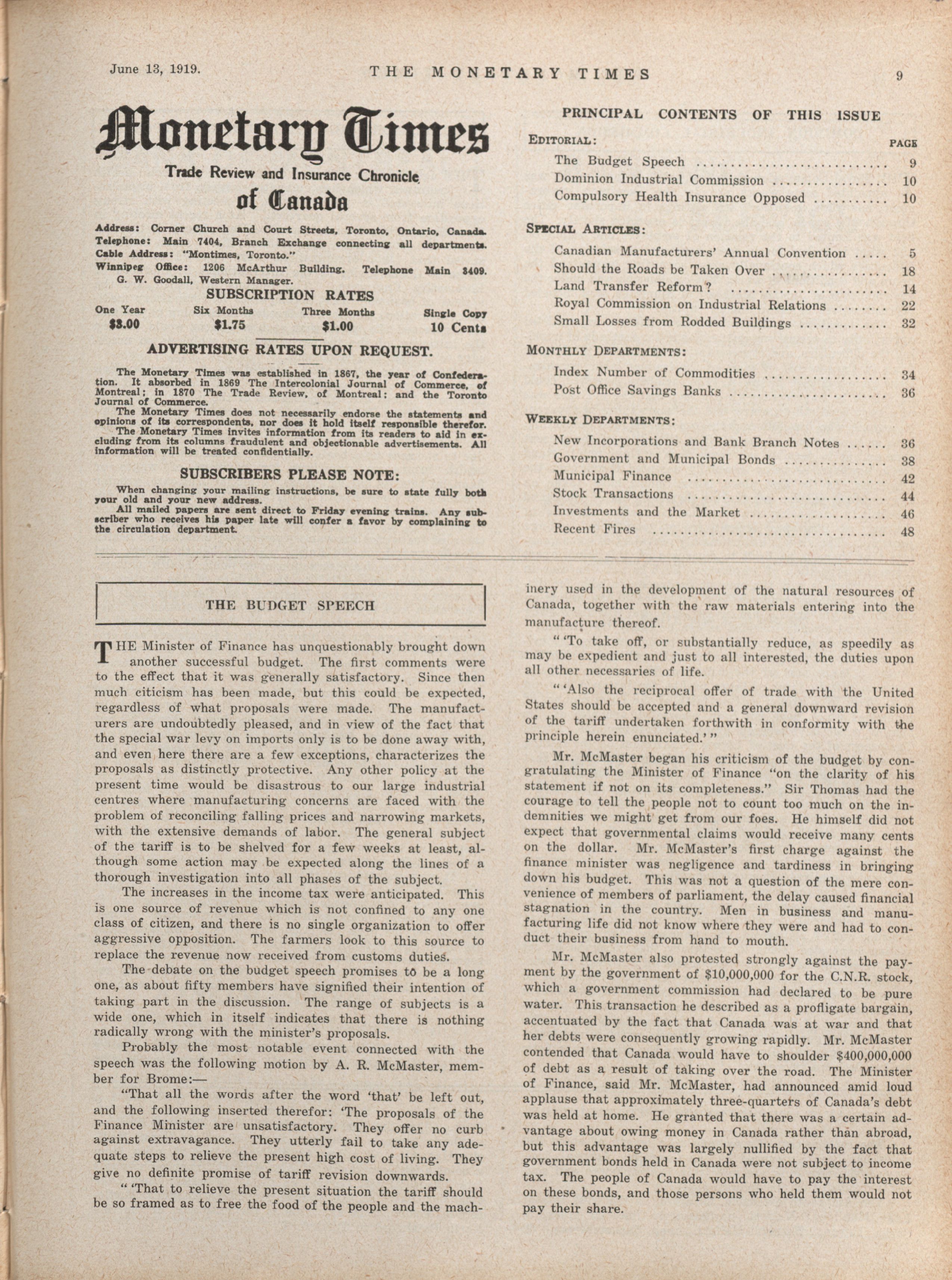 - The Monetary Times, trade review and insurance chronicle. : Volume 62 No. 24 (June 13, 1919)