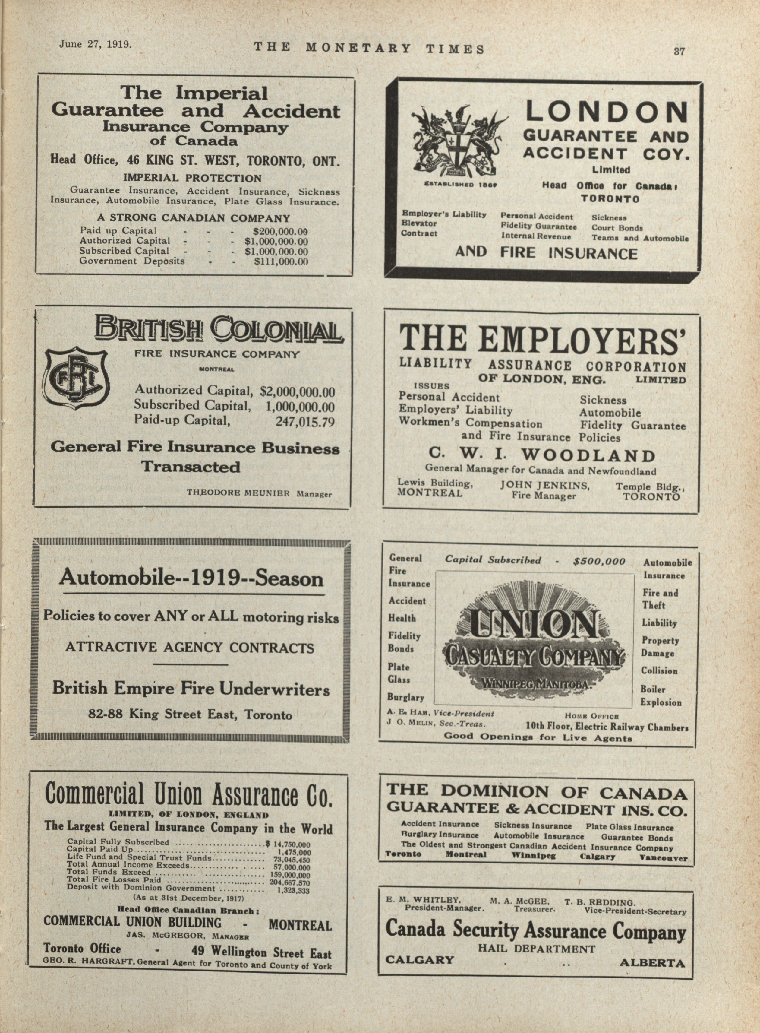 - The Monetary Times, trade review and insurance chronicle. : Volume 62 No. 26 (June 27, 1919)