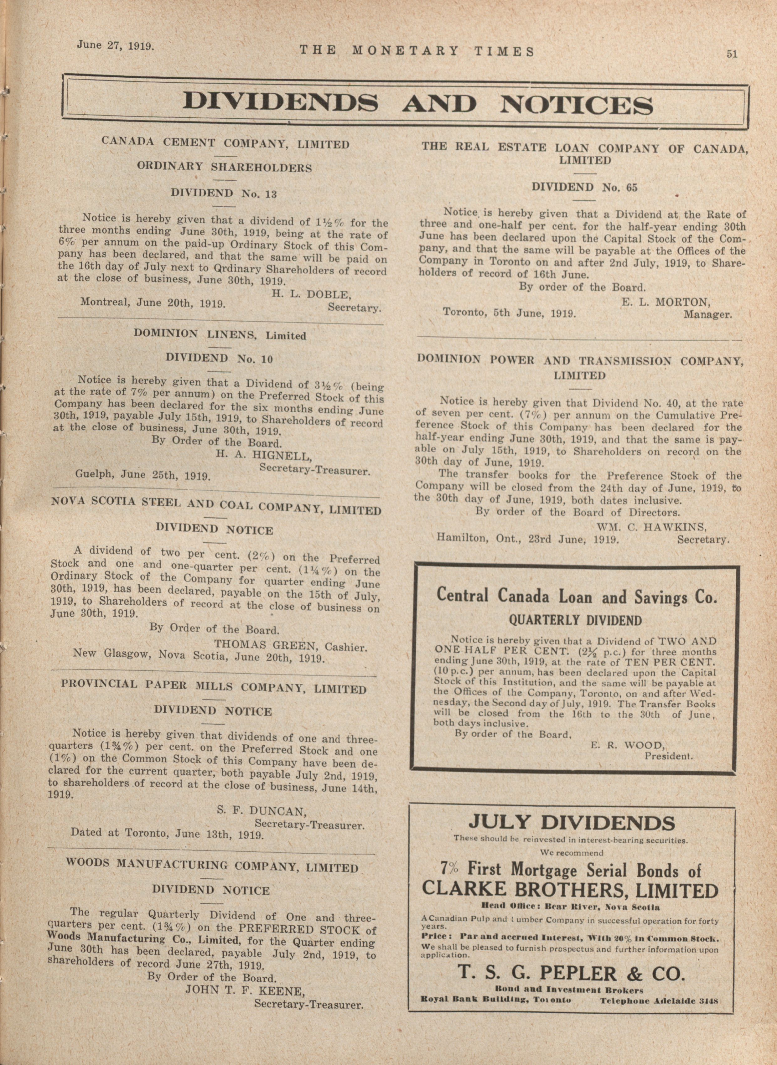- The Monetary Times, trade review and insurance chronicle. : Volume 62 No. 26 (June 27, 1919)