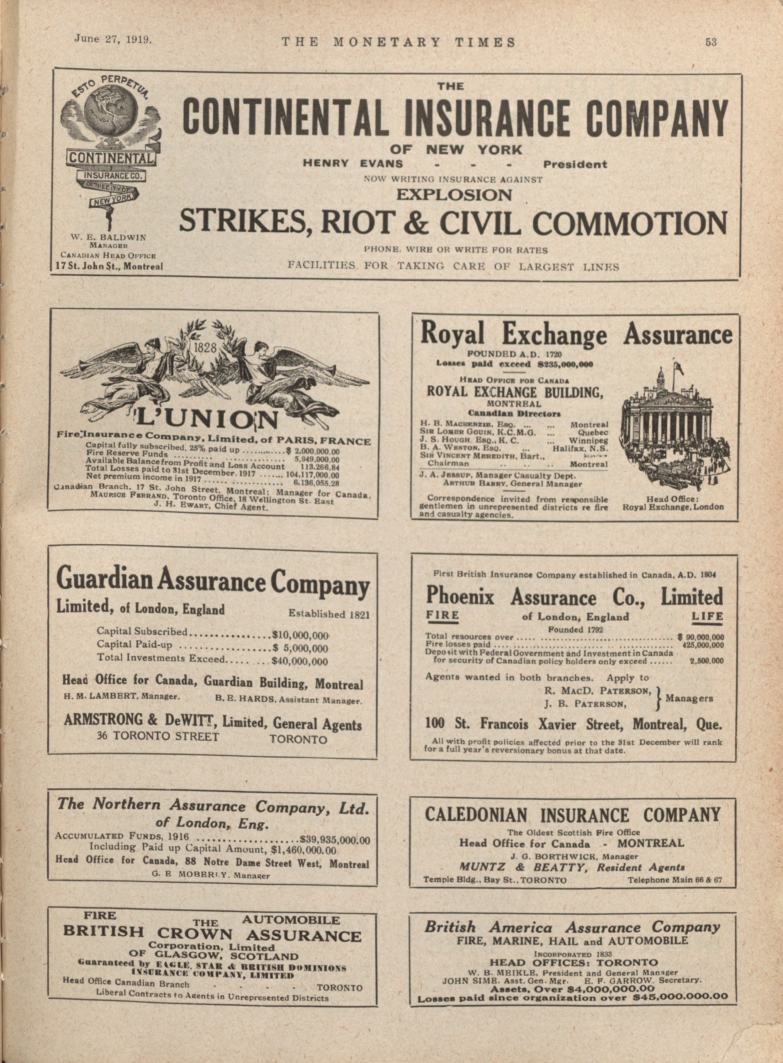 - The Monetary Times, trade review and insurance chronicle. : Volume 62 No. 26 (June 27, 1919)