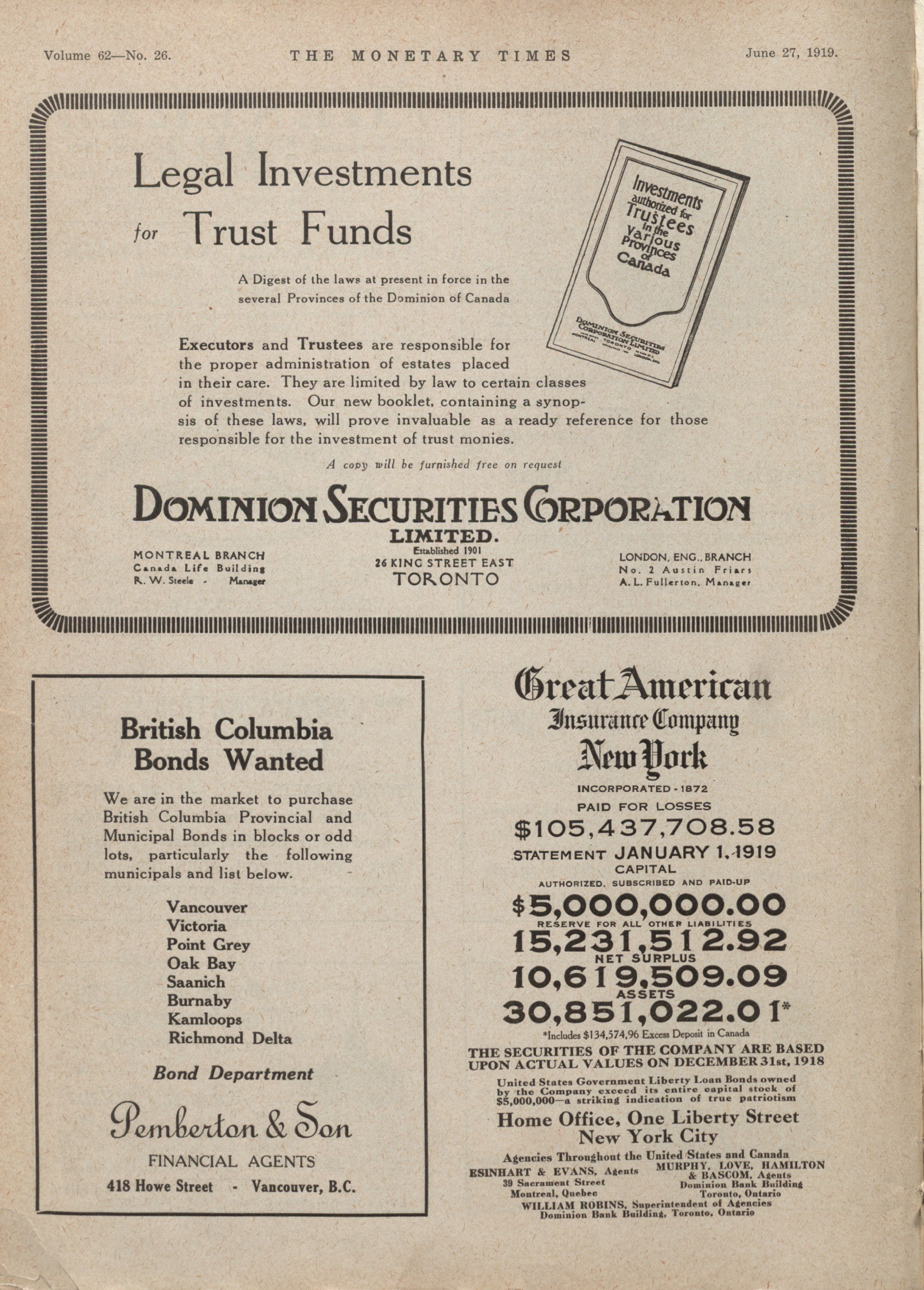 - The Monetary Times, trade review and insurance chronicle. : Volume 62 No. 26 (June 27, 1919)