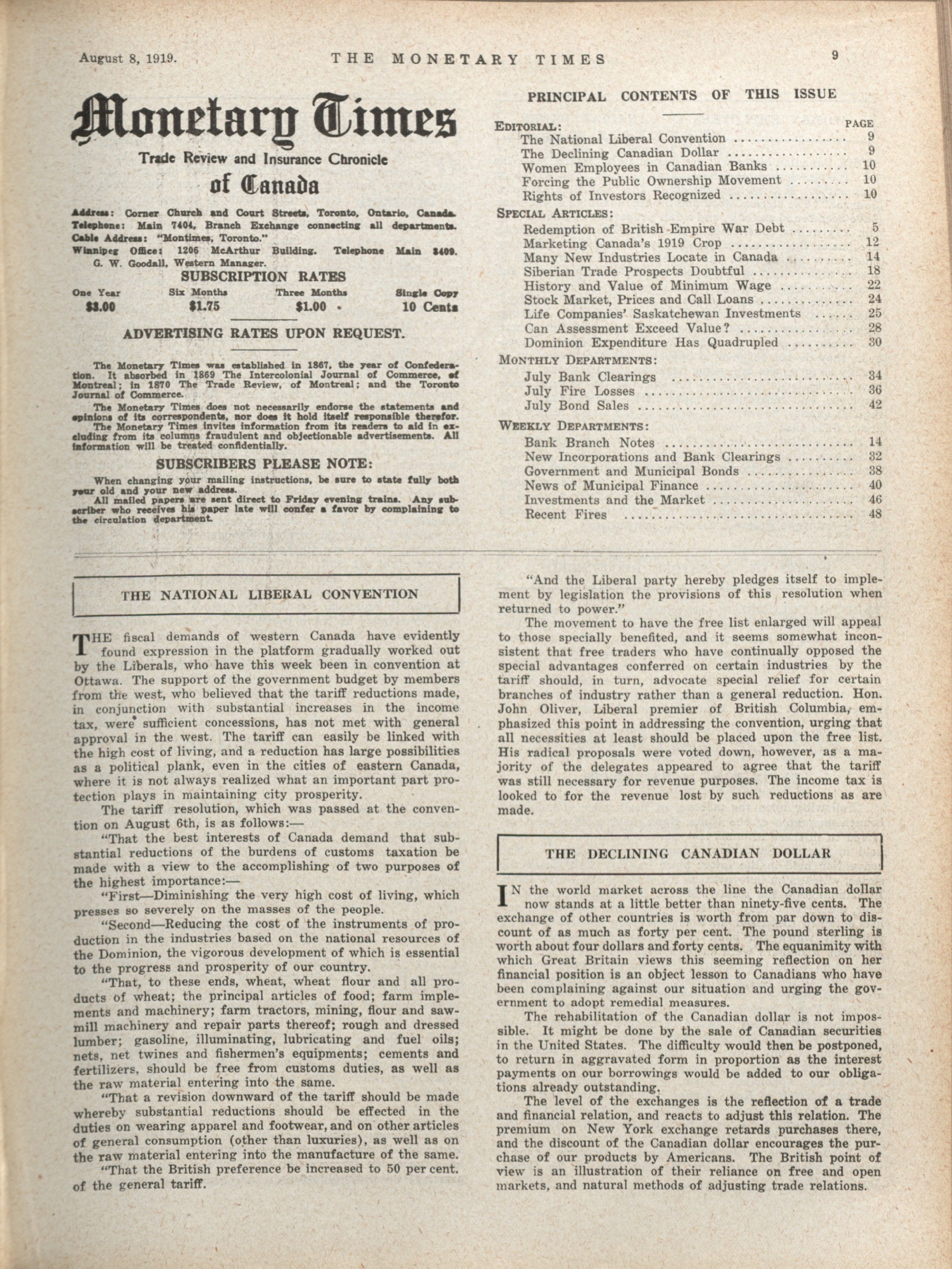 - The Monetary Times, trade review and insurance chronicle. : Volume 63 No. 6 (August 8, 1919)