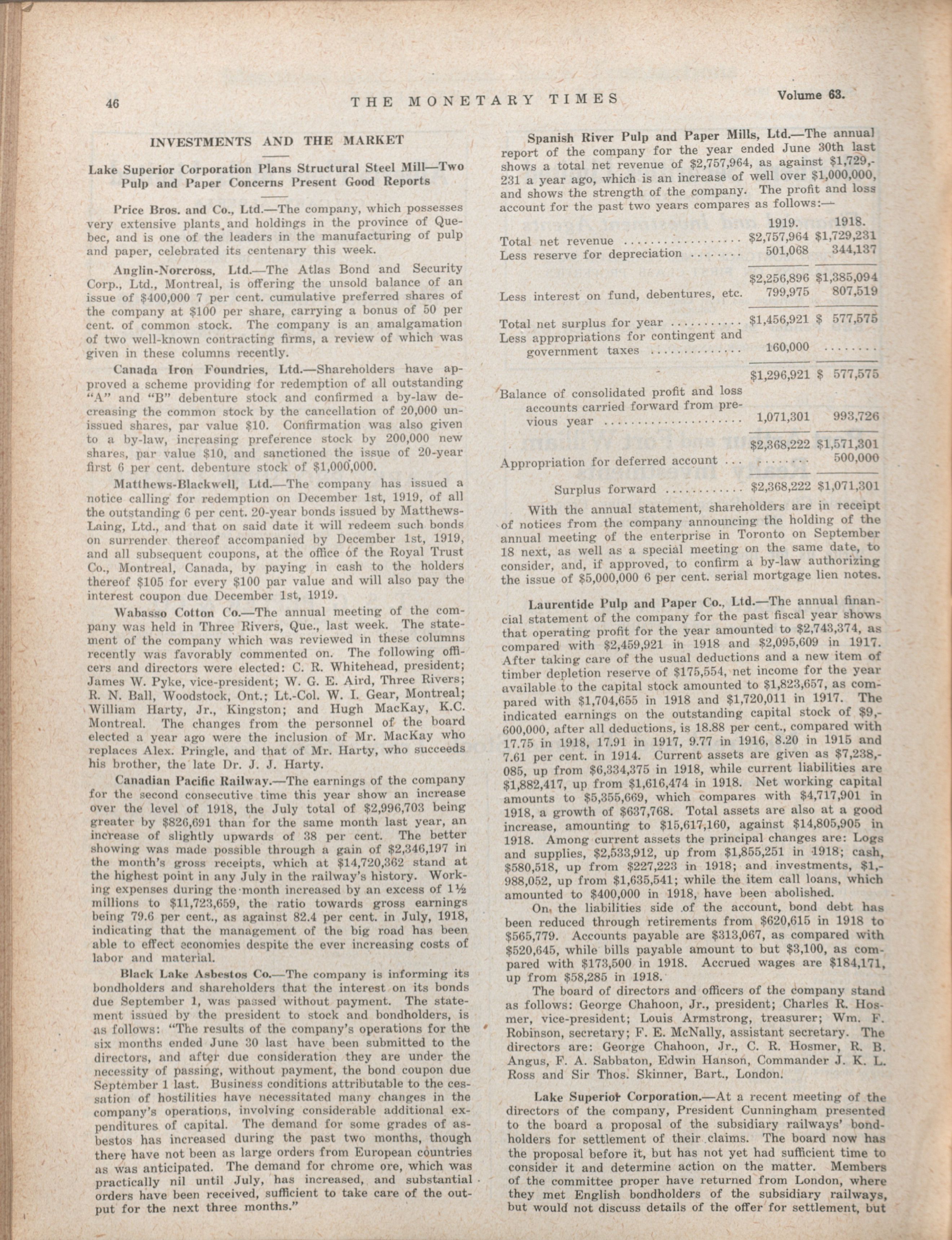 - The Monetary Times, trade review and insurance chronicle. : Volume 63 No. 10 (September 5, 1919)