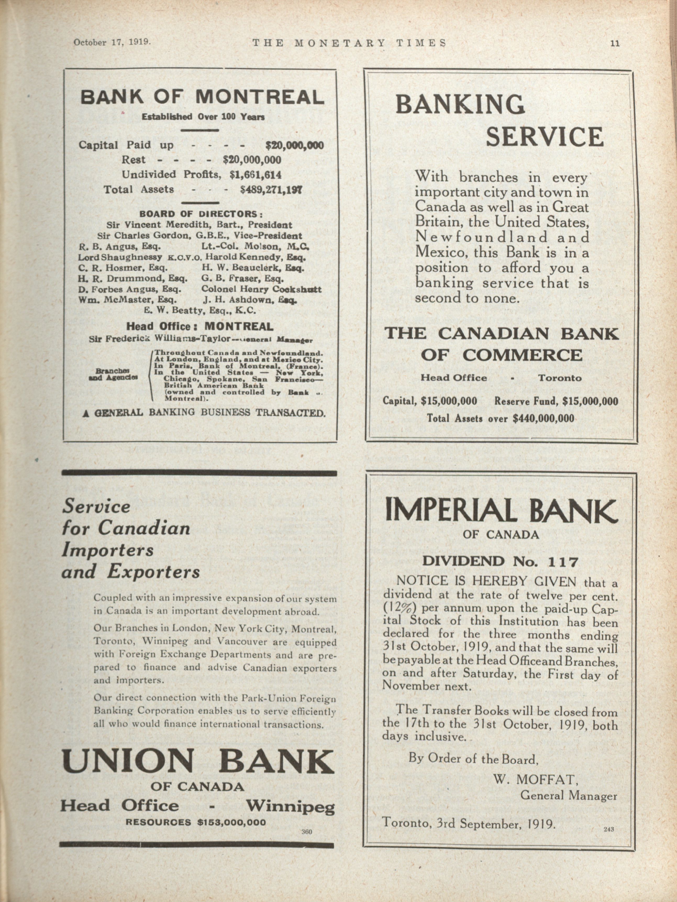 - The Monetary Times, trade review and insurance chronicle. : Volume 63 No. 16 (October 17, 1919)