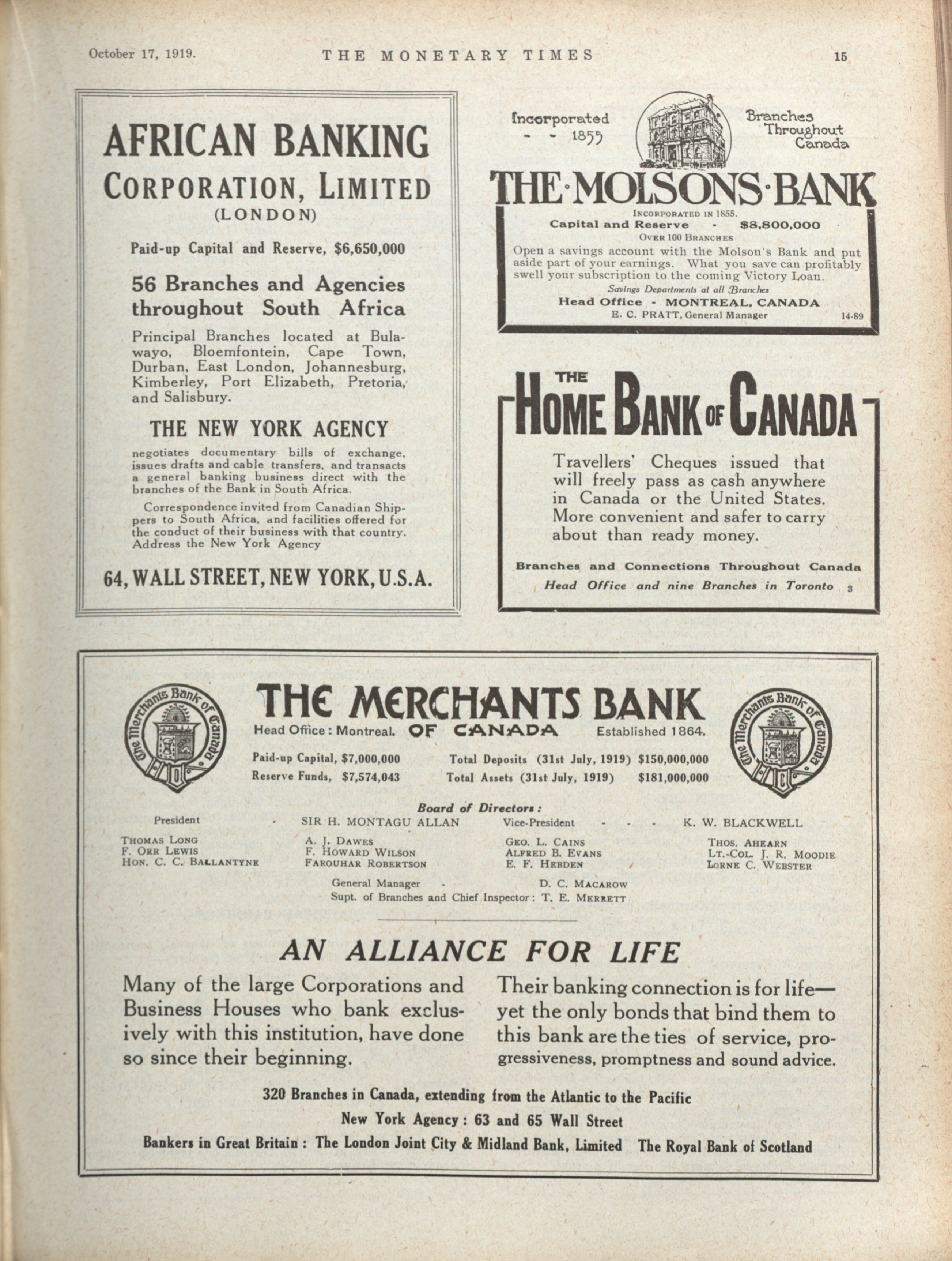 - The Monetary Times, trade review and insurance chronicle. : Volume 63 No. 16 (October 17, 1919)