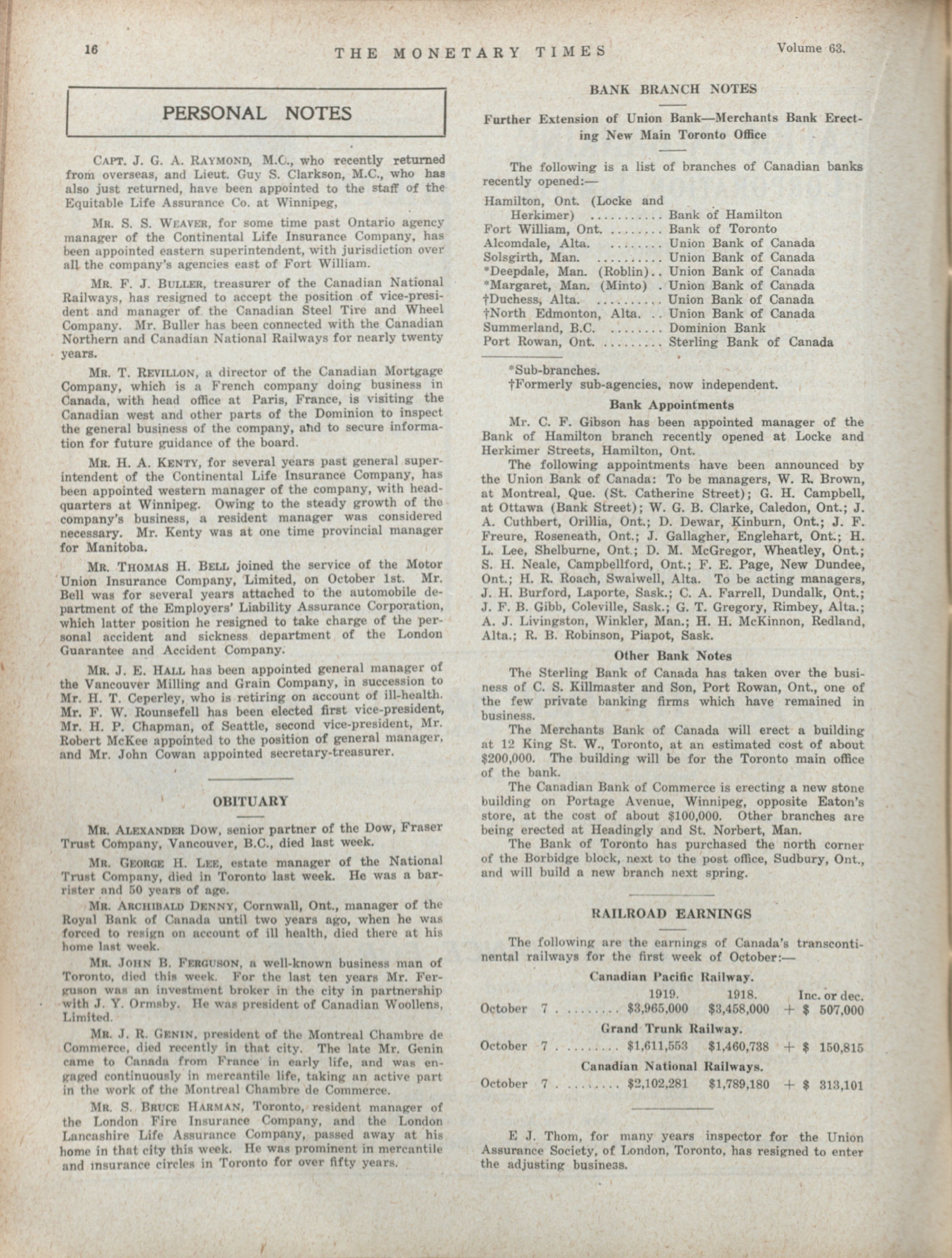 - The Monetary Times, trade review and insurance chronicle. : Volume 63 No. 16 (October 17, 1919)
