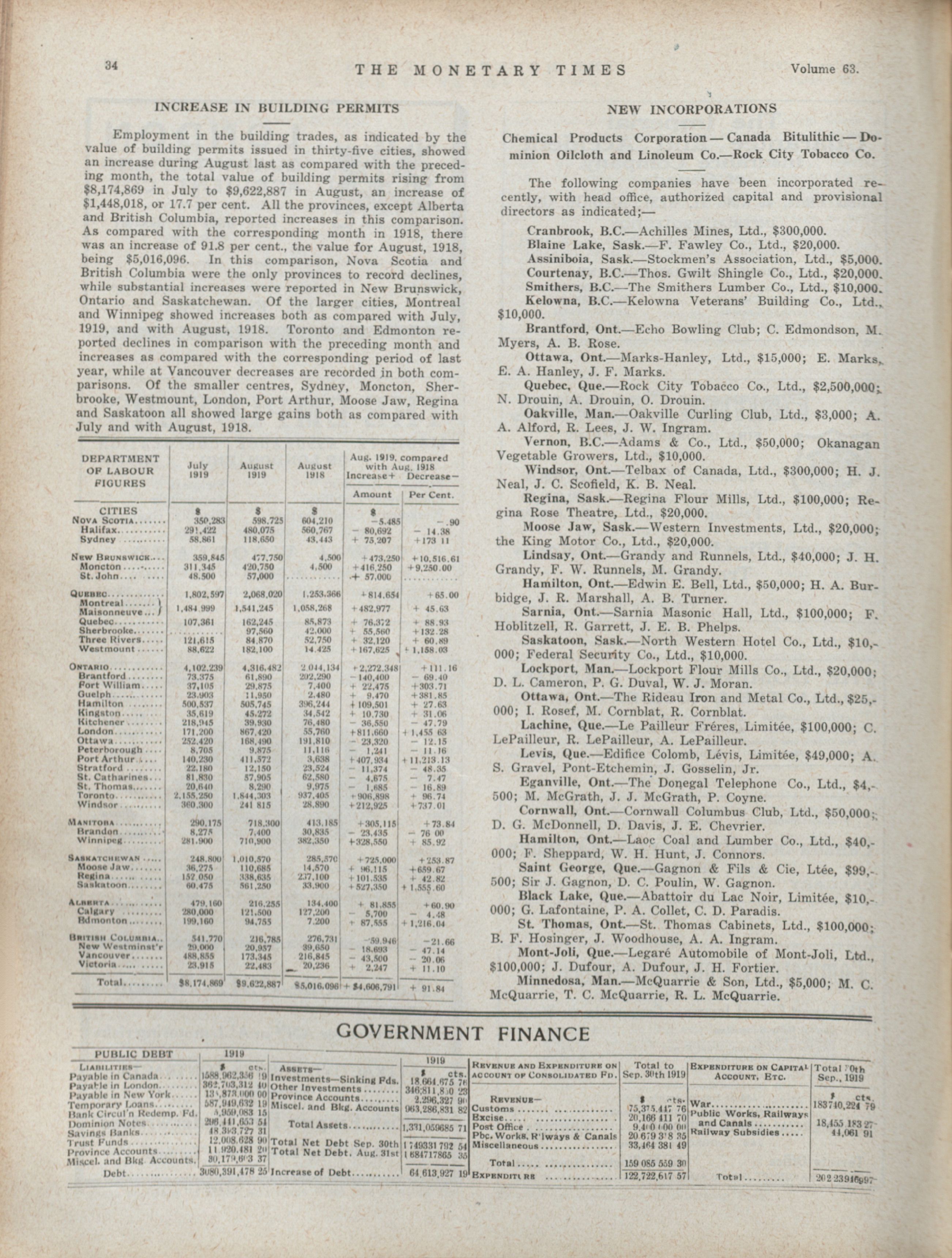 - The Monetary Times, trade review and insurance chronicle. : Volume 63 No. 16 (October 17, 1919)