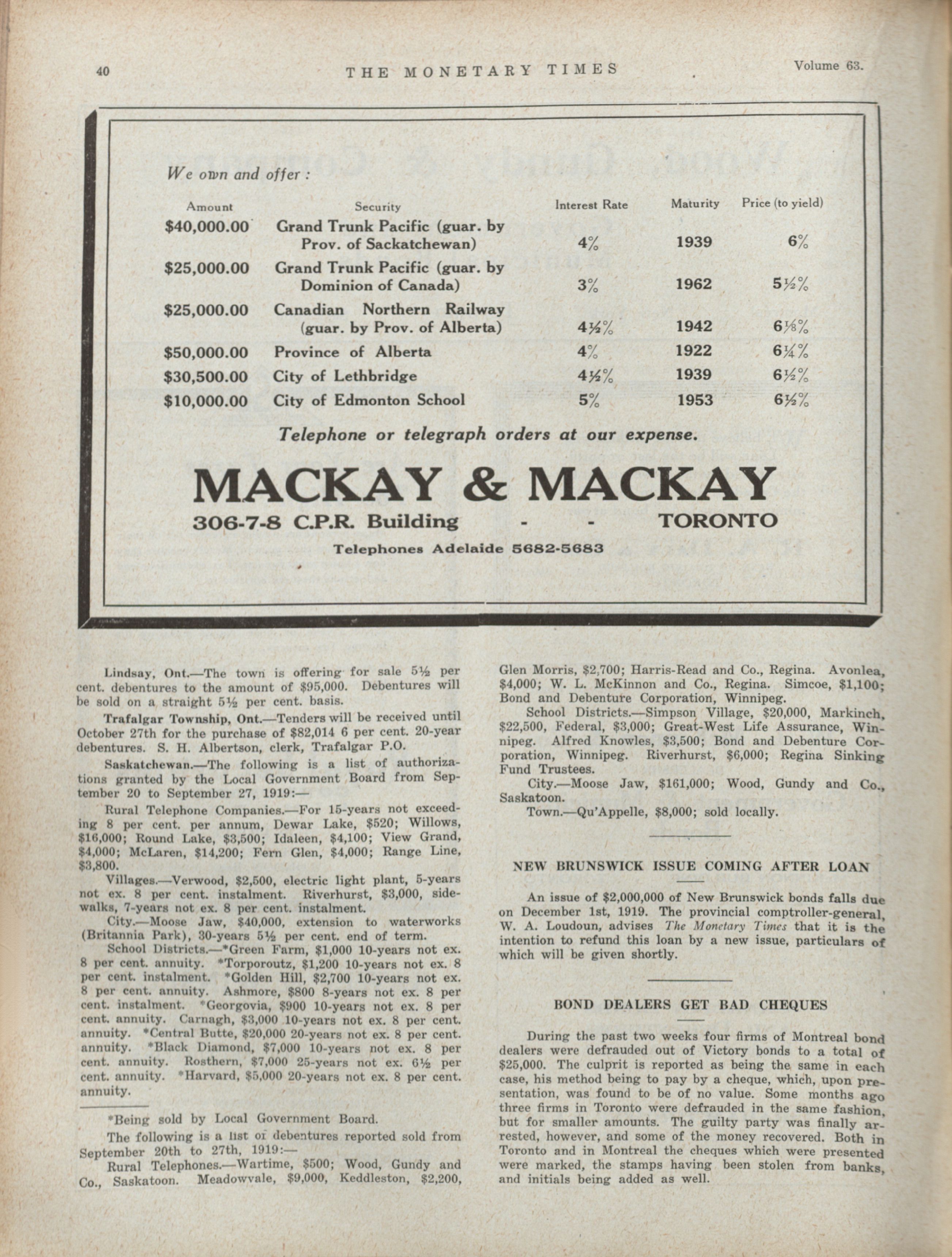 - The Monetary Times, trade review and insurance chronicle. : Volume 63 No. 16 (October 17, 1919)