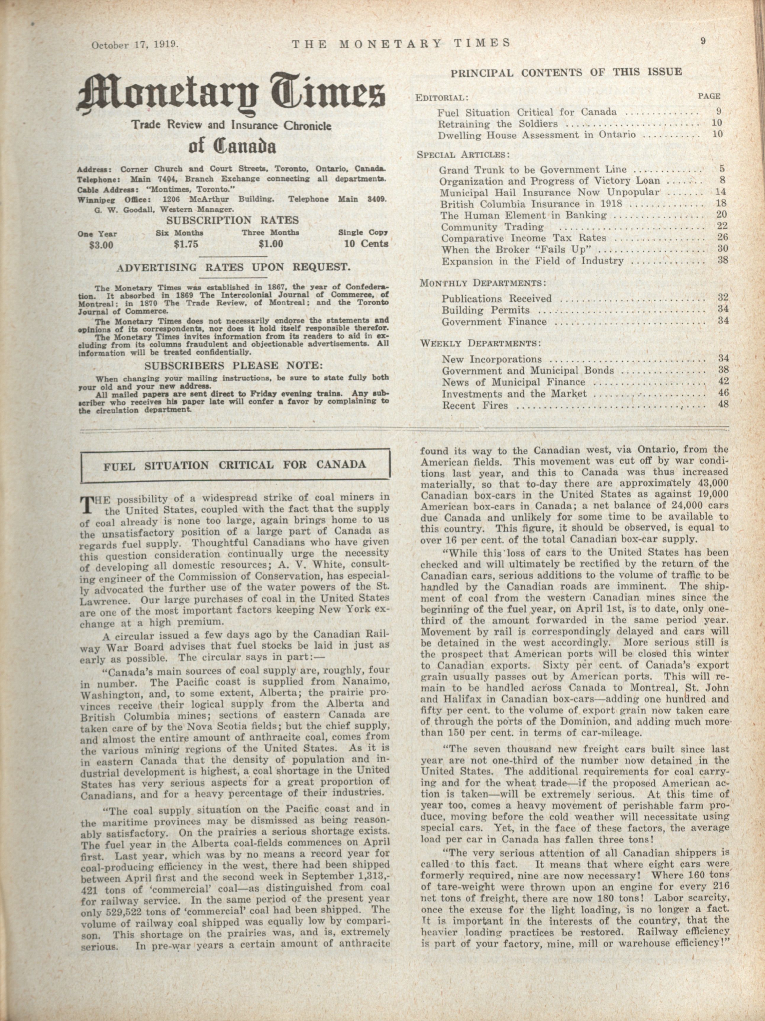 - The Monetary Times, trade review and insurance chronicle. : Volume 63 No. 16 (October 17, 1919)