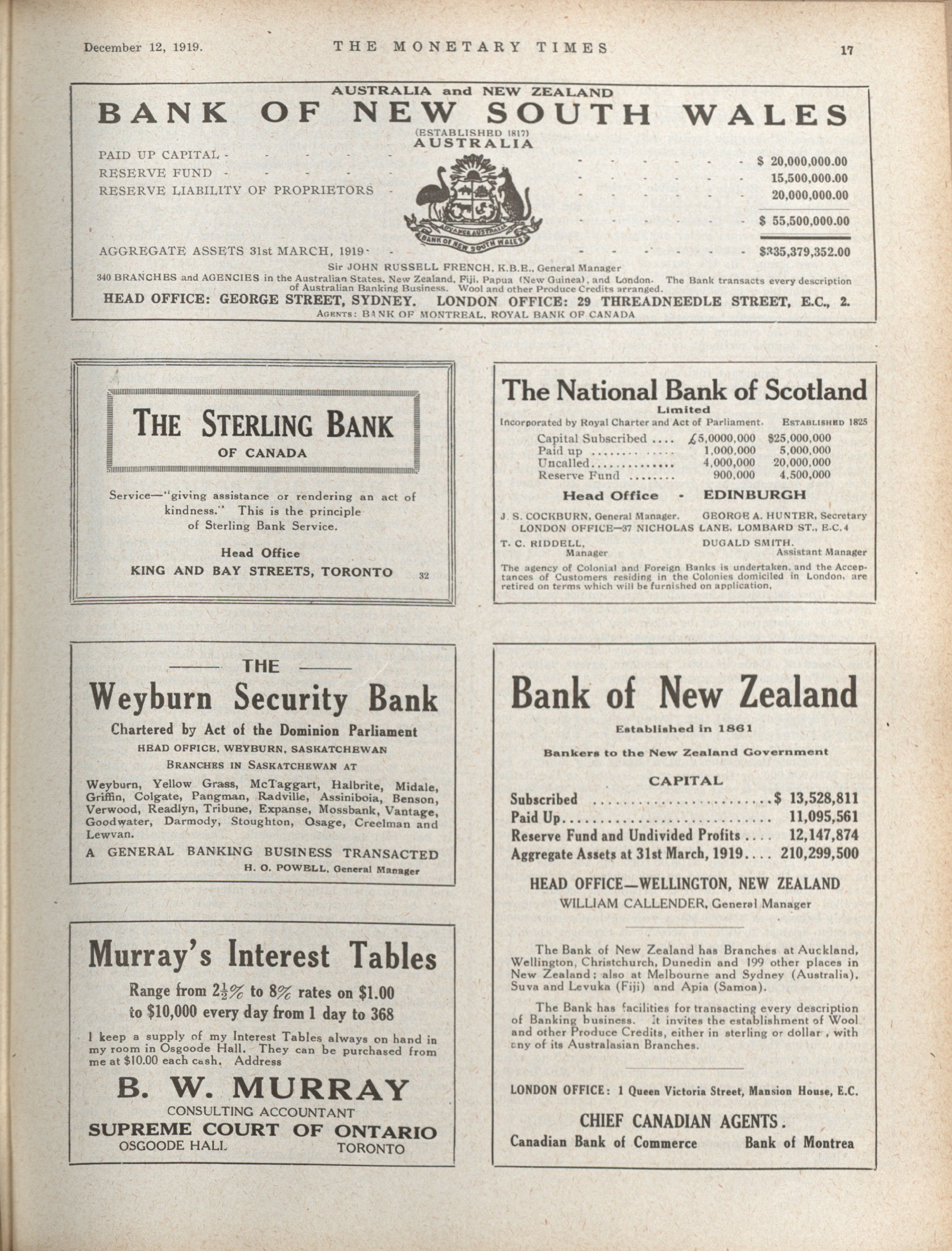 - The Monetary Times, trade review and insurance chronicle. : Volume 63 No. 24 (December 12, 1919)