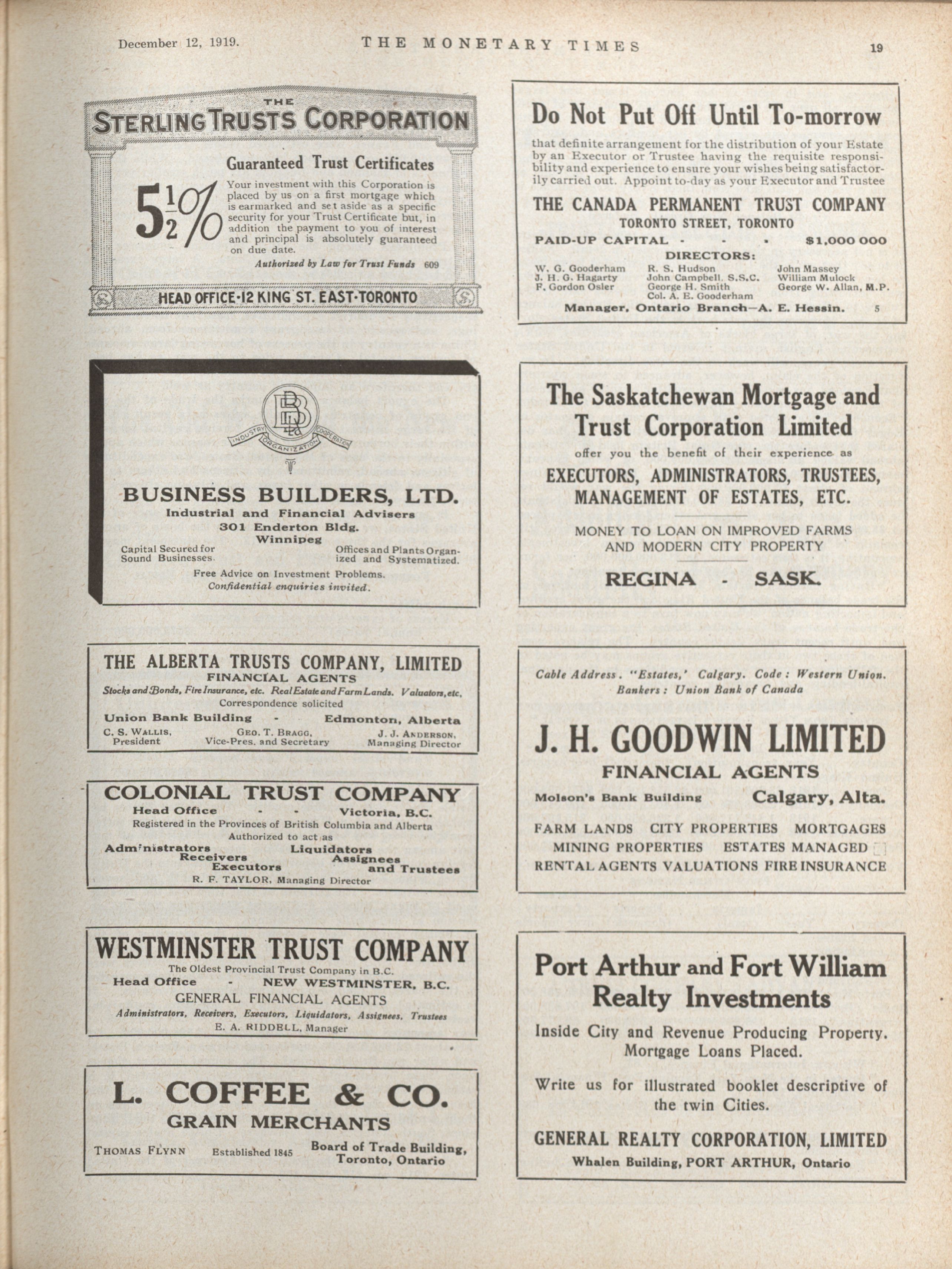 - The Monetary Times, trade review and insurance chronicle. : Volume 63 No. 24 (December 12, 1919)