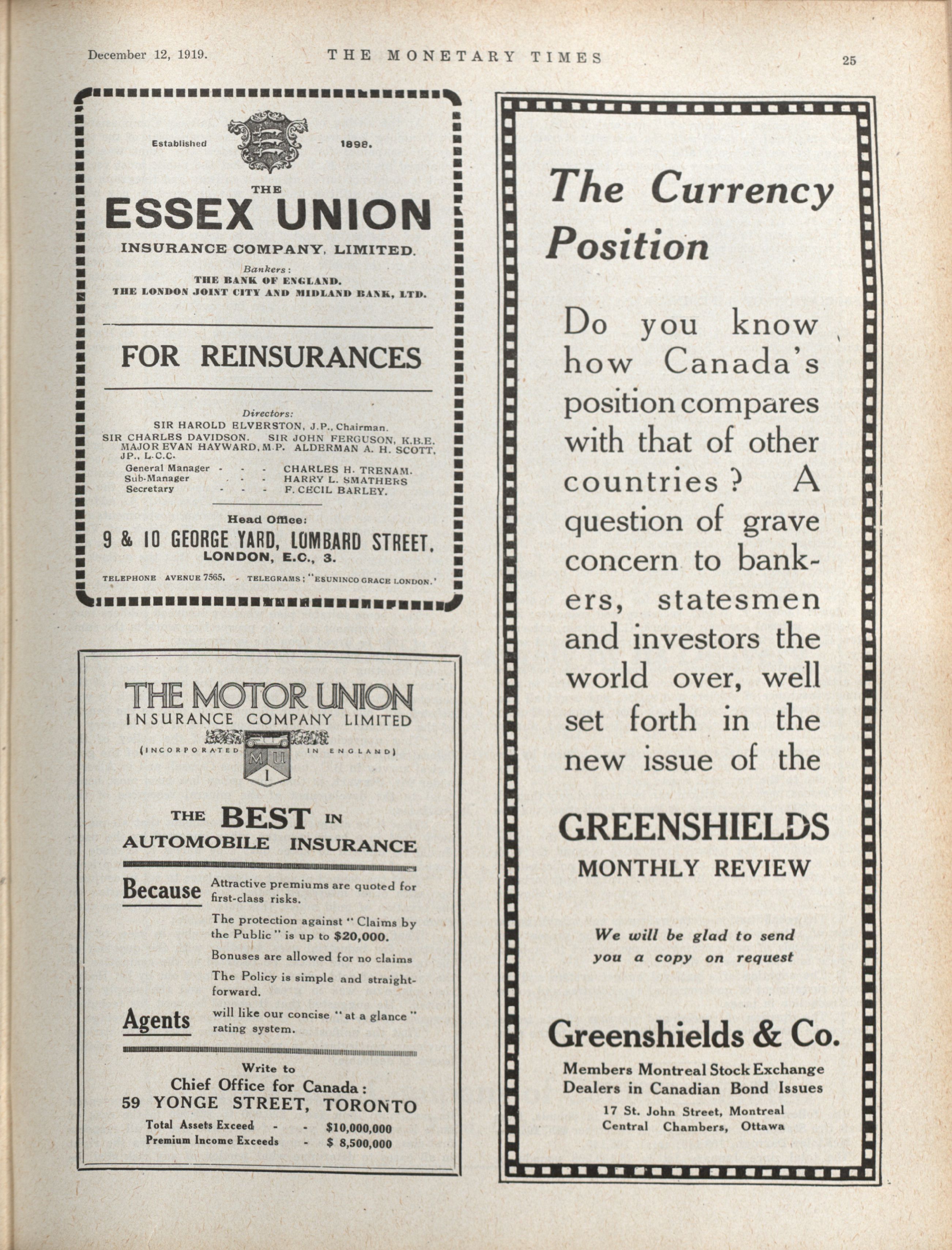 - The Monetary Times, trade review and insurance chronicle. : Volume 63 No. 24 (December 12, 1919)