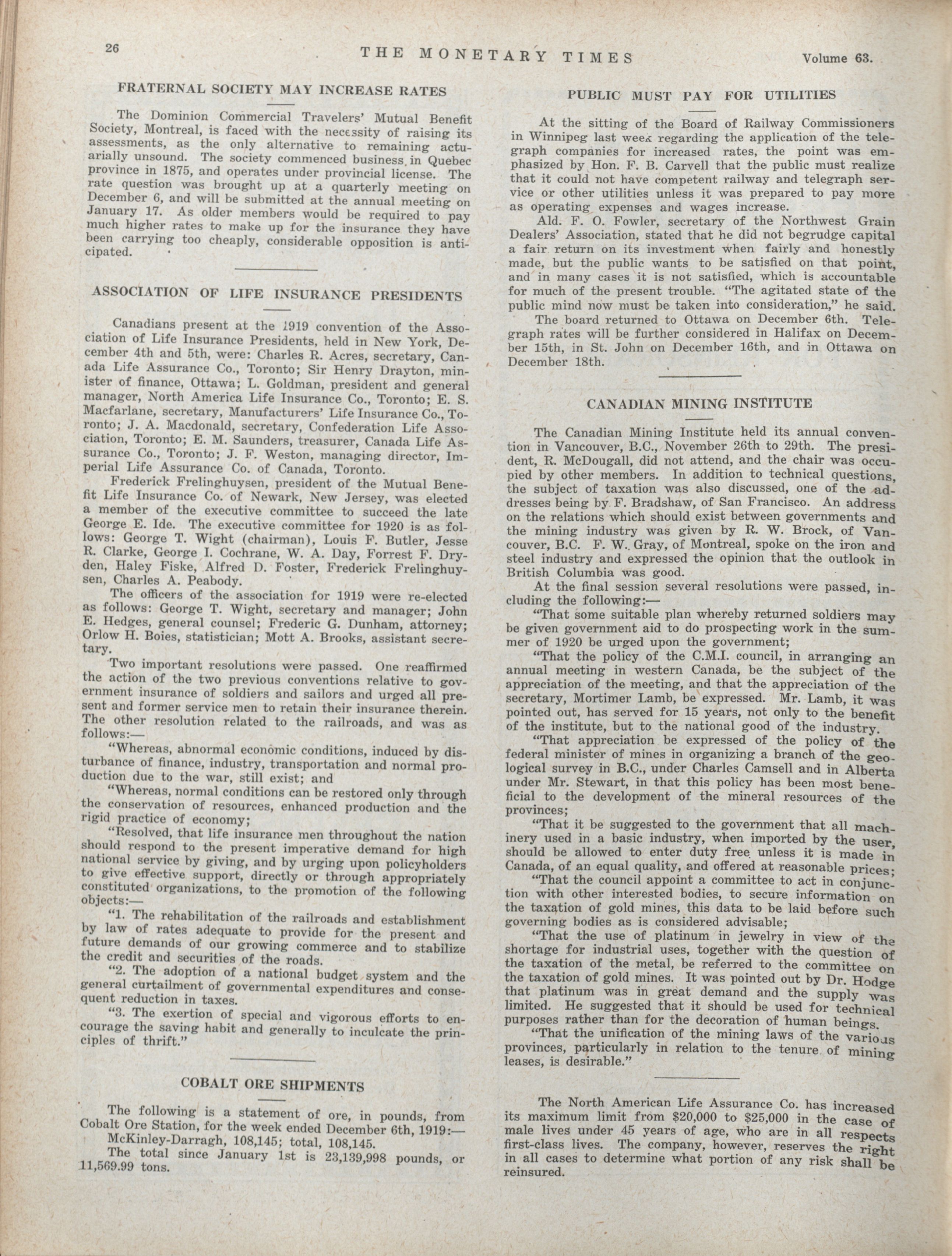 - The Monetary Times, trade review and insurance chronicle. : Volume 63 No. 24 (December 12, 1919)