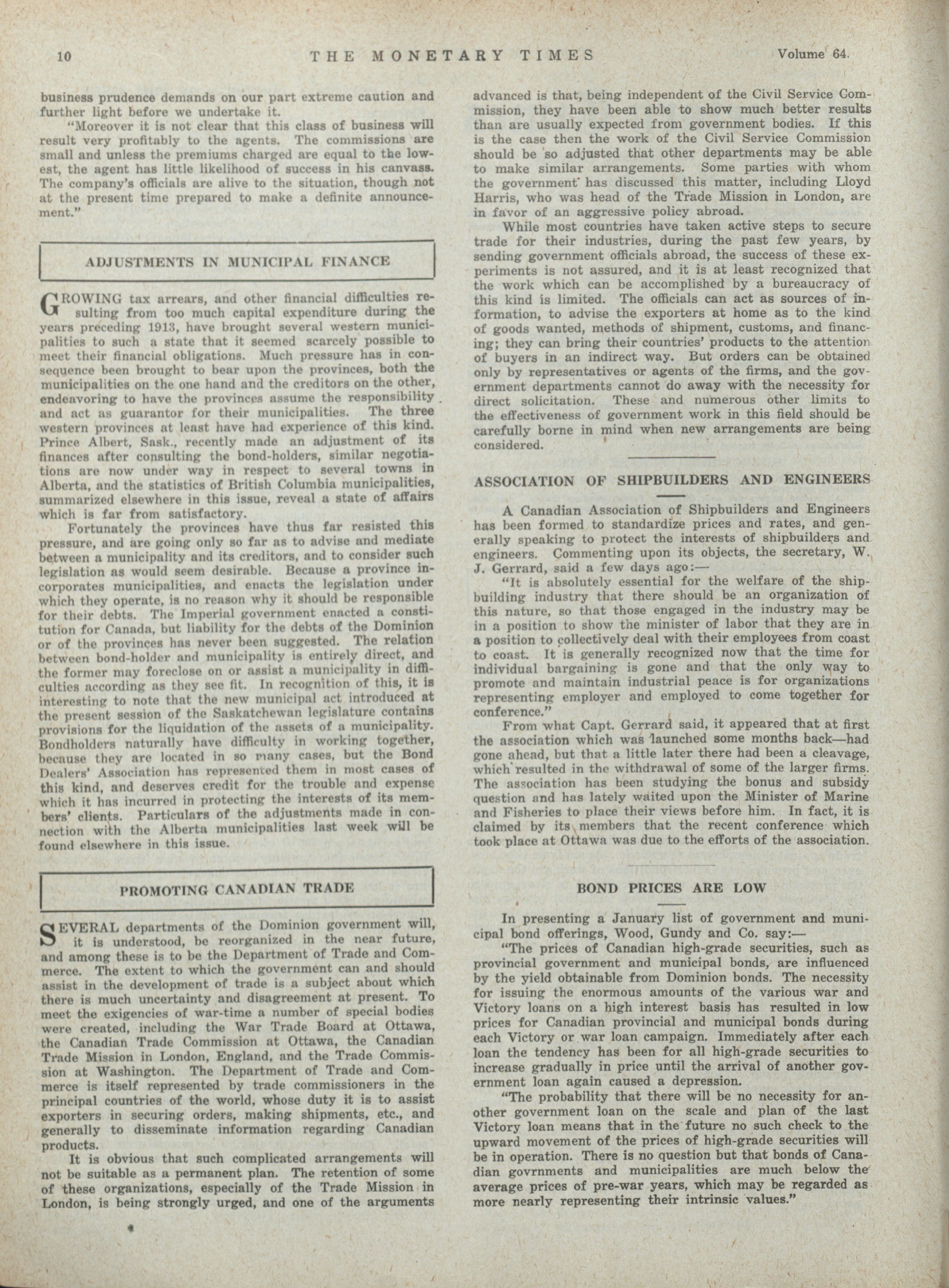 - The Monetary Times, trade review and insurance chronicle. : Volume 64 No. 3 (January 16, 1920)