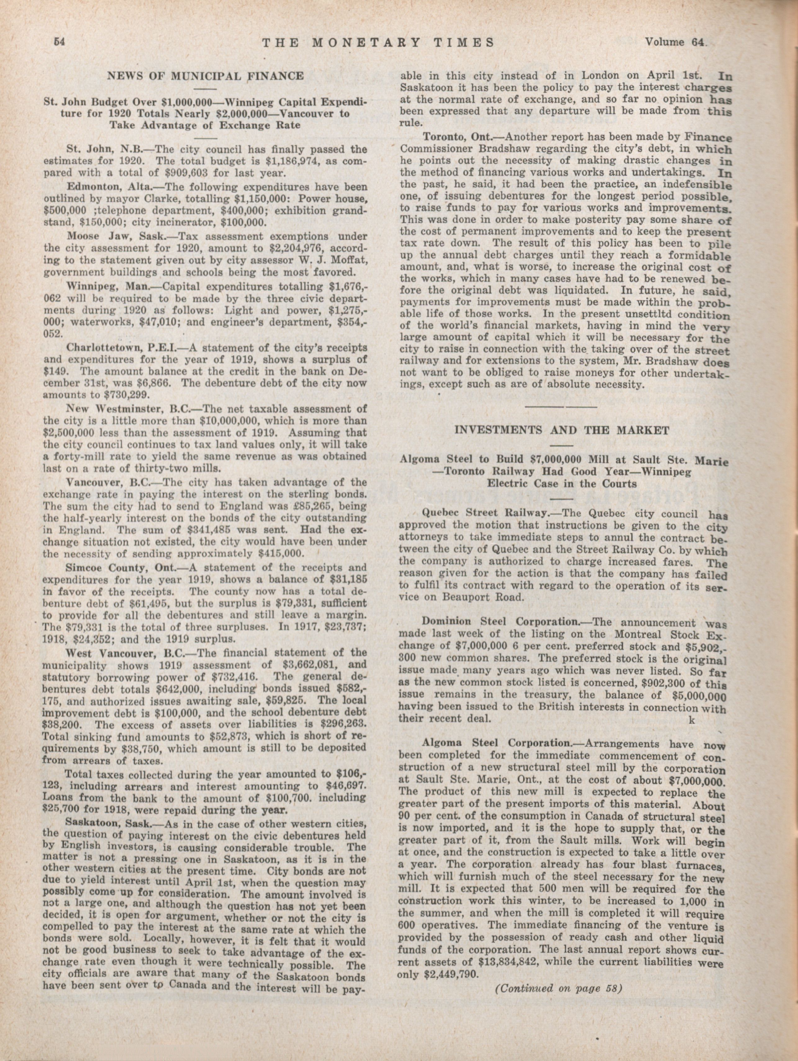 - The Monetary Times, trade review and insurance chronicle. : Volume 64 No. 6 (February 6, 1920)